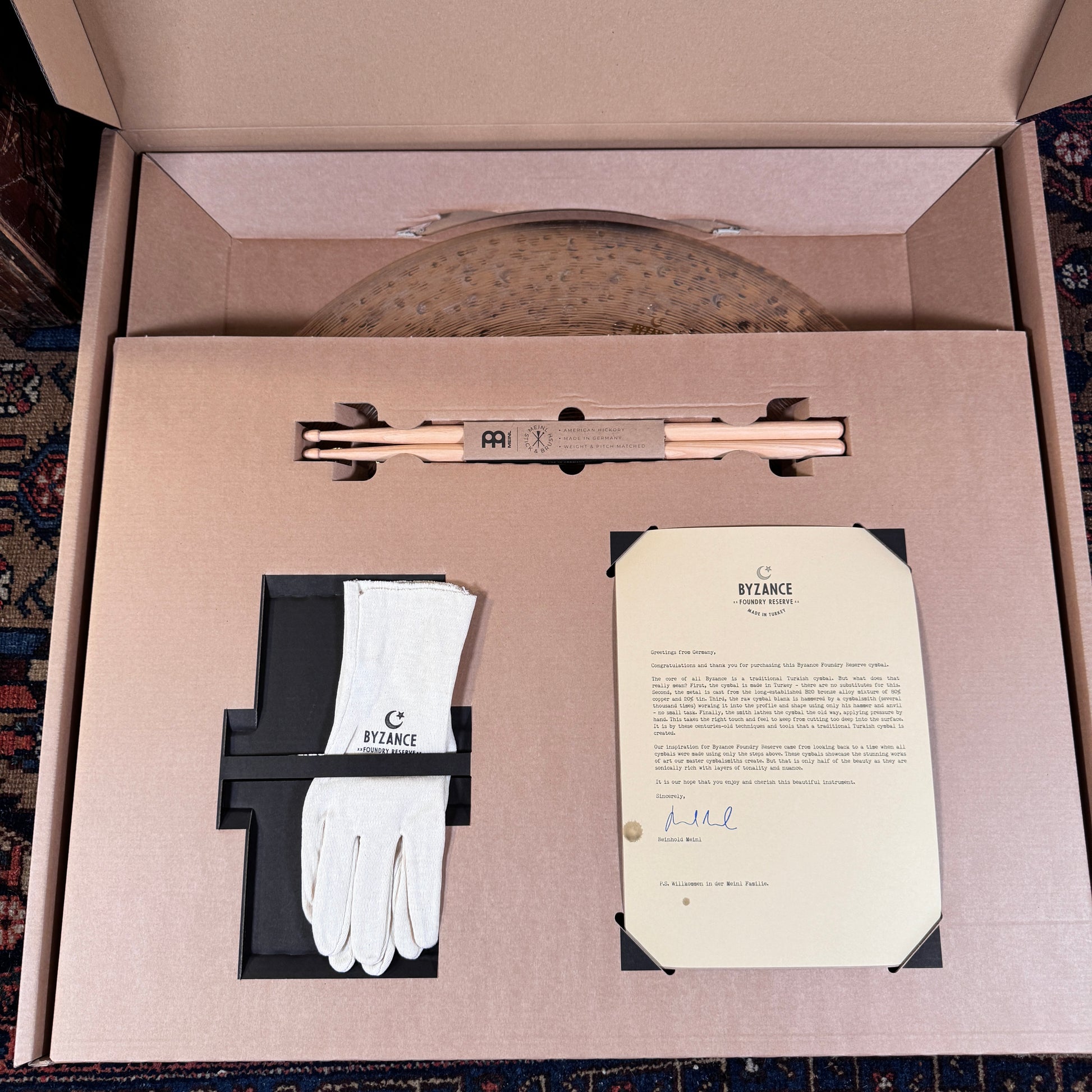 For your kind consideration is this brand new 24" Meinl Byzance Foundry Reserve Light Ride cymbal. This versatile light ride has a light wash that's dark and brooding and can explode quickly into an ominous crash. Hand hammered from B20 Bronze Alloy for a unique sound with a dark, complex character and mid-dark timbre. It has a bright attack with a lush wash of undertones that responds great to mallets too. Weighs in at 2665 grams. Enjoy!