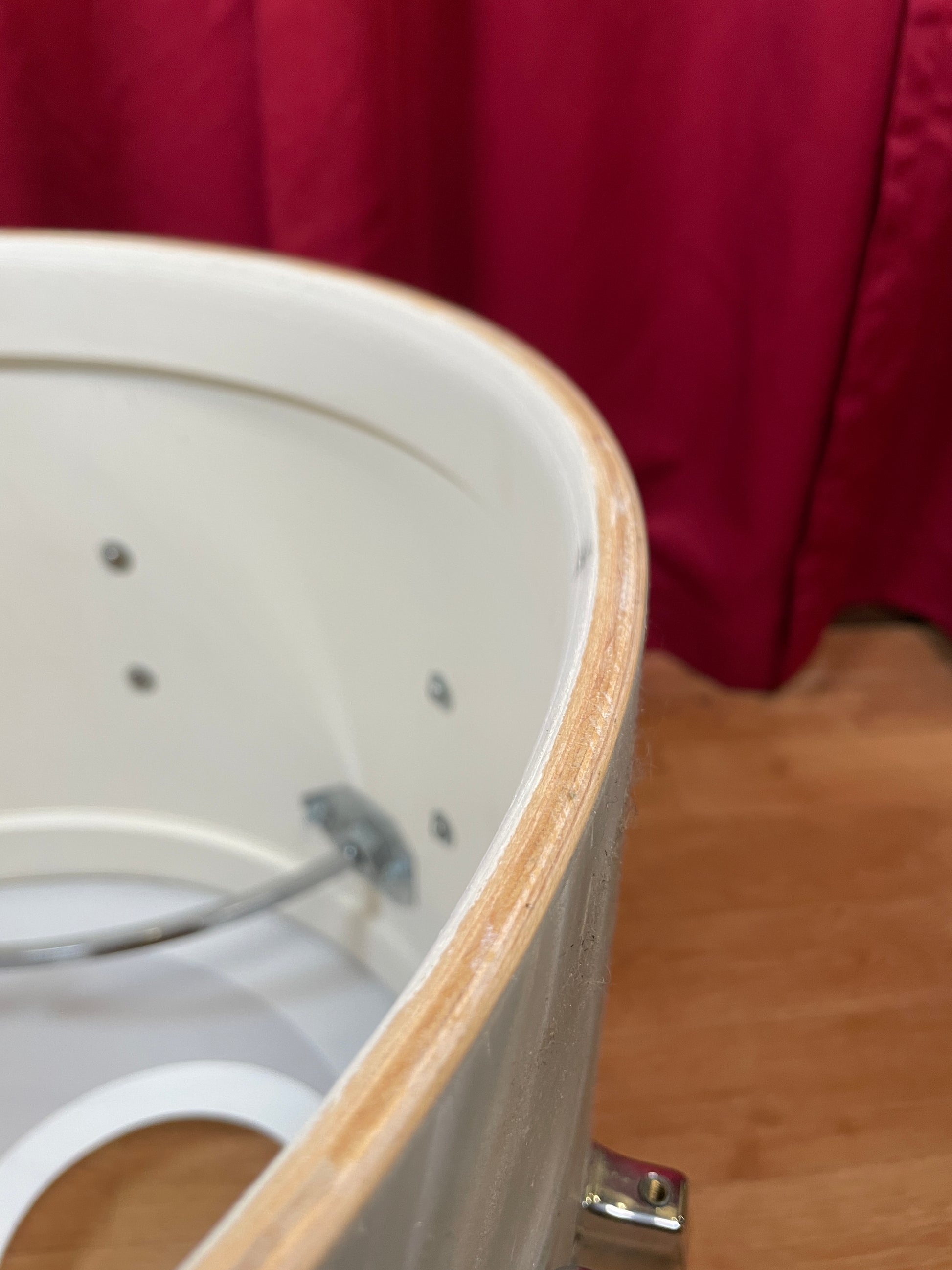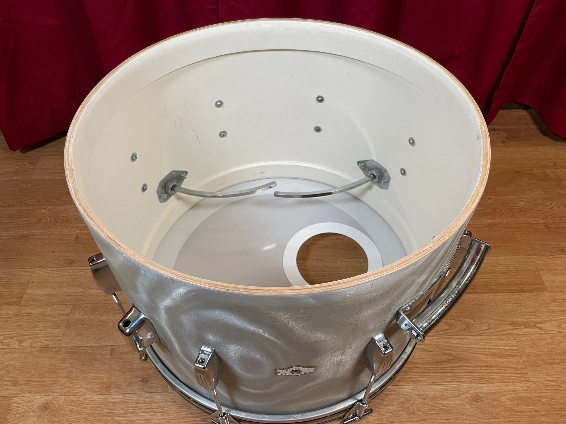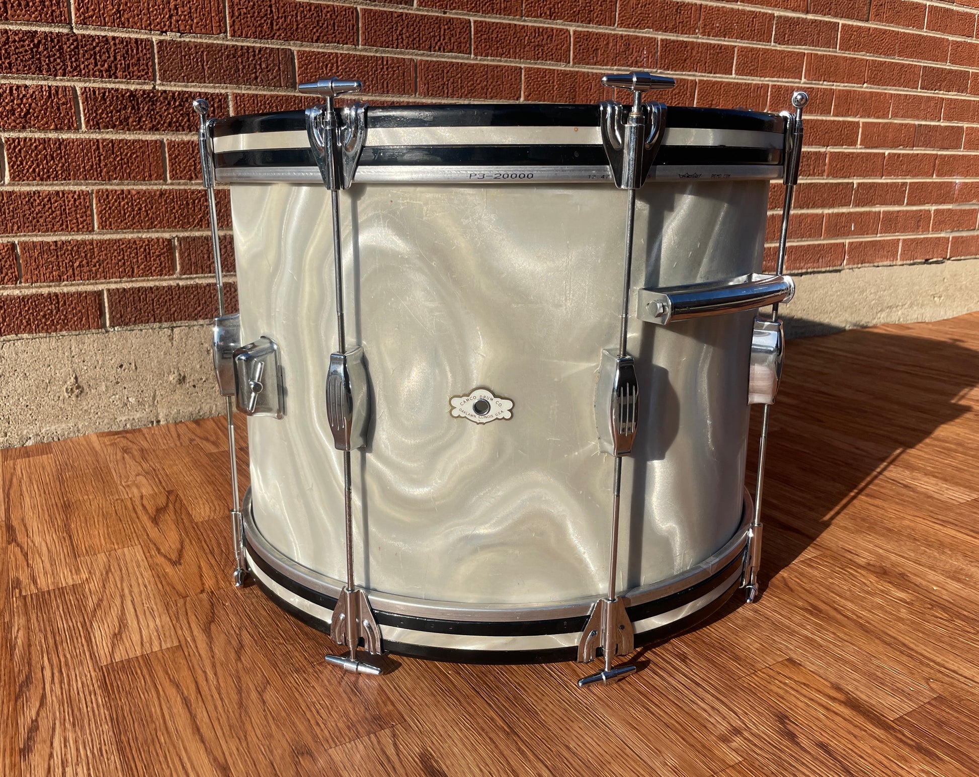 For your viewing pleasure is this vintage Camco Aristocrat 14x20 bass drum in a rare White Moire wrap. It's in great condition and has typical light wear including some light surface scuffs and typical spider webbing. All original Camco parts. Missing the top part of the rail consolette. There are no extra holes or modifications and the bearing edges are true and original. Most importantly, it tunes up with the greatest of ease and sounds absolutely fantastic. Enjoy!