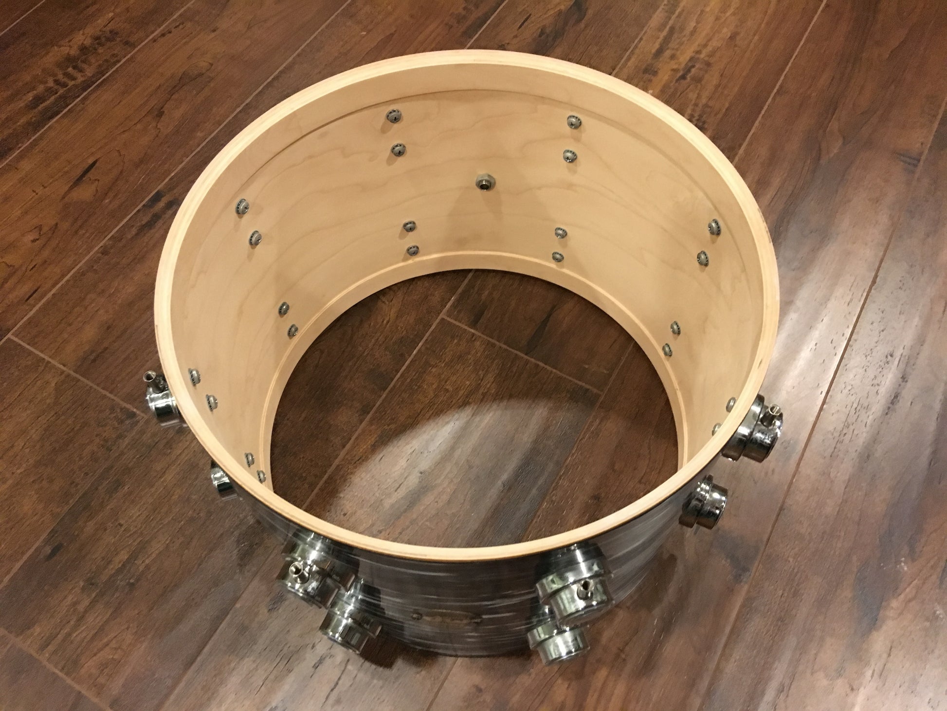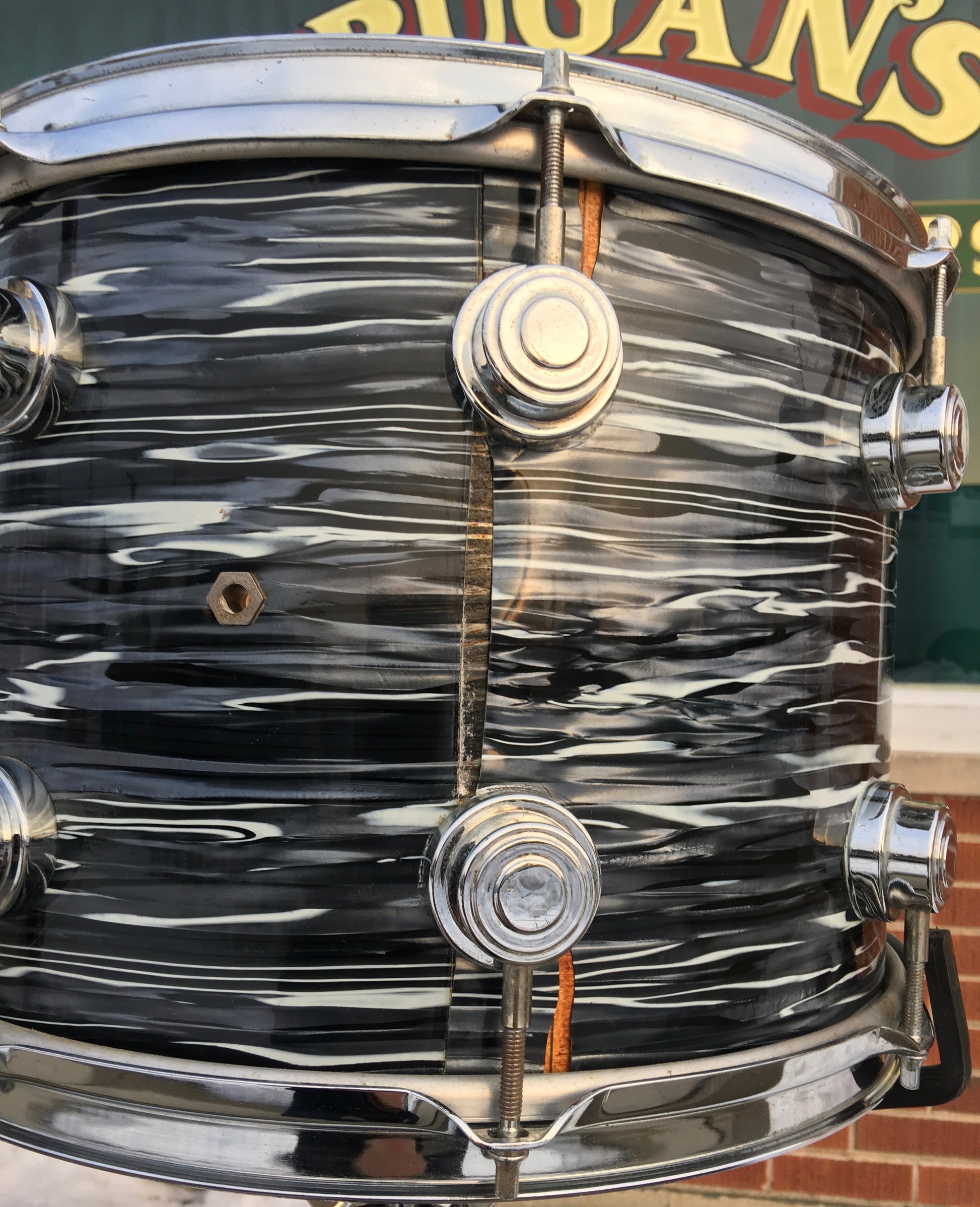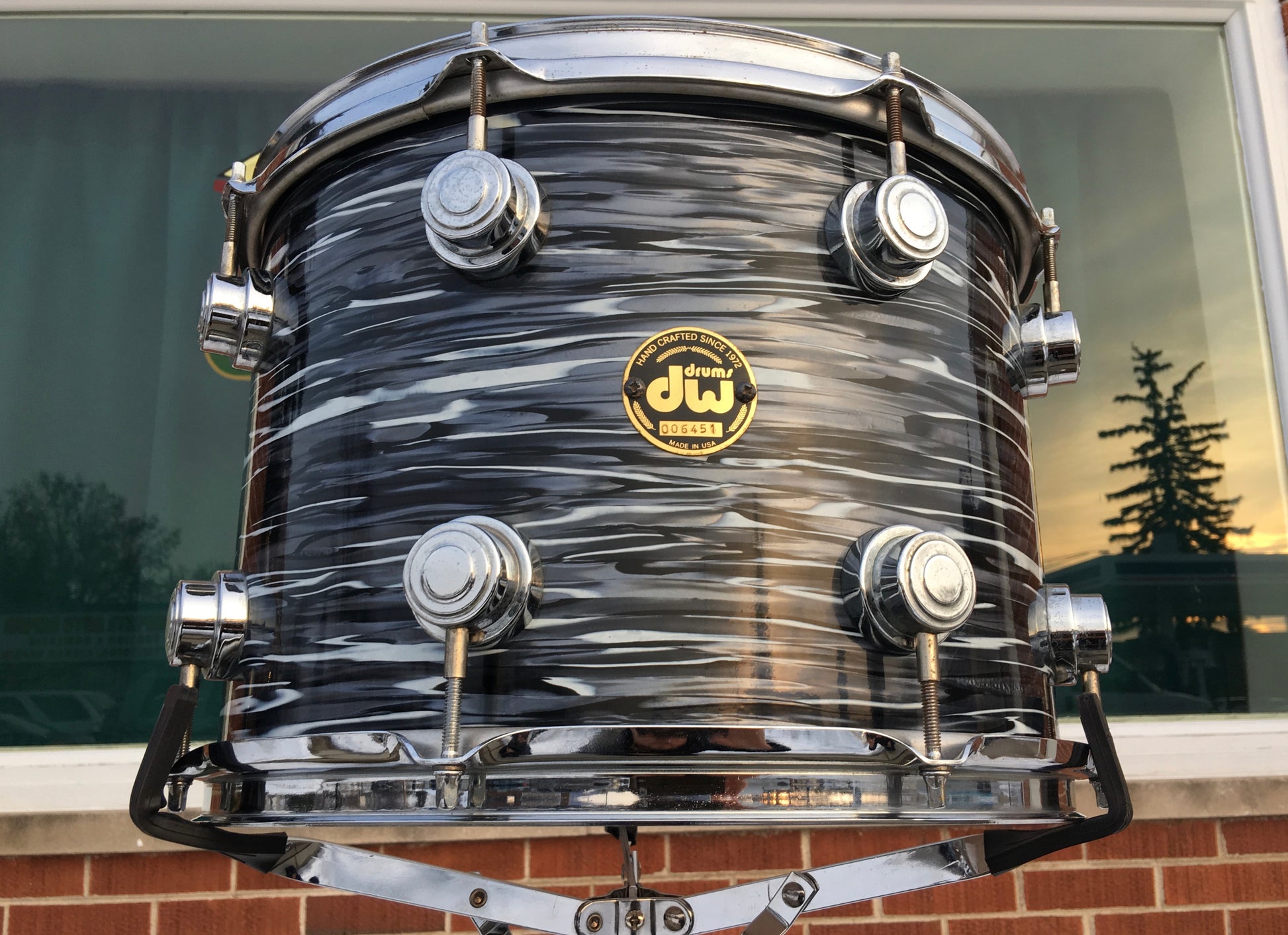 For your viewing pleasure is this pre-1999 D.W. 12"(deep)X14" tom. There are no extra holes or modifications of any kind. The drum is in overall good shape, but the wrap has shrunk by the seam resulting in some splits in the wrap, and there is some pitting on the chrome. The bearing edges are true and original. It tunes up perfectly and sound great! Enjoy!