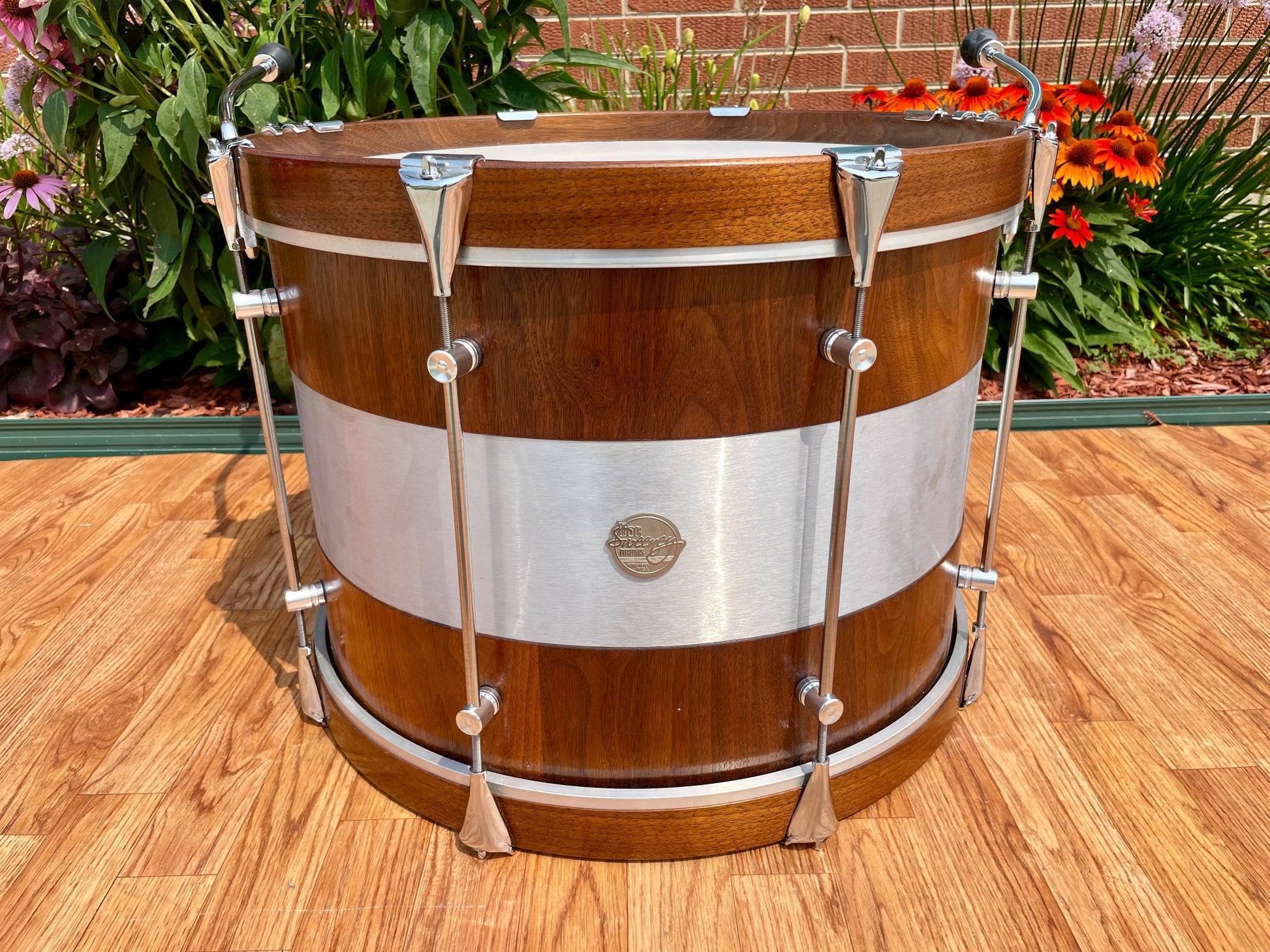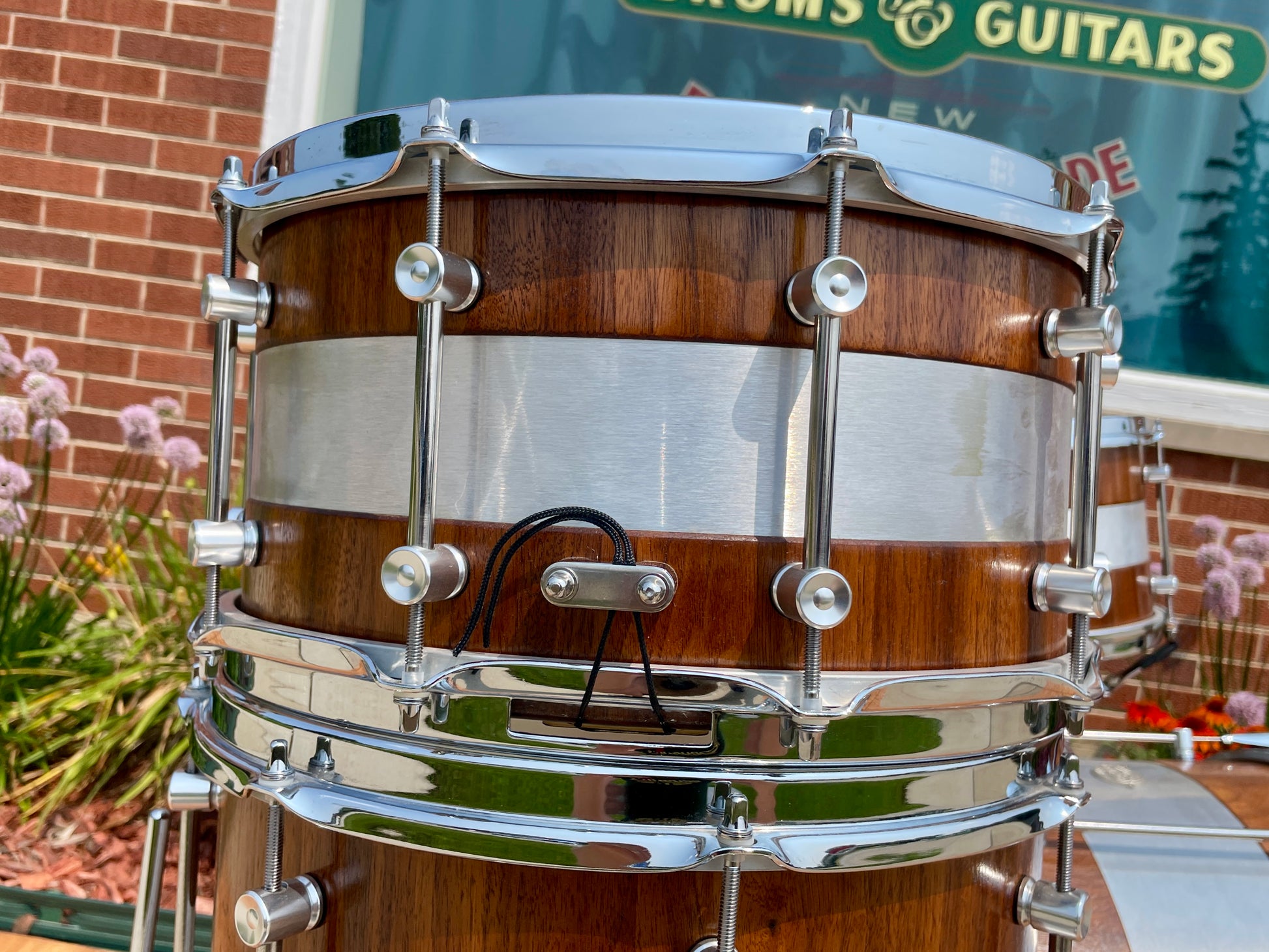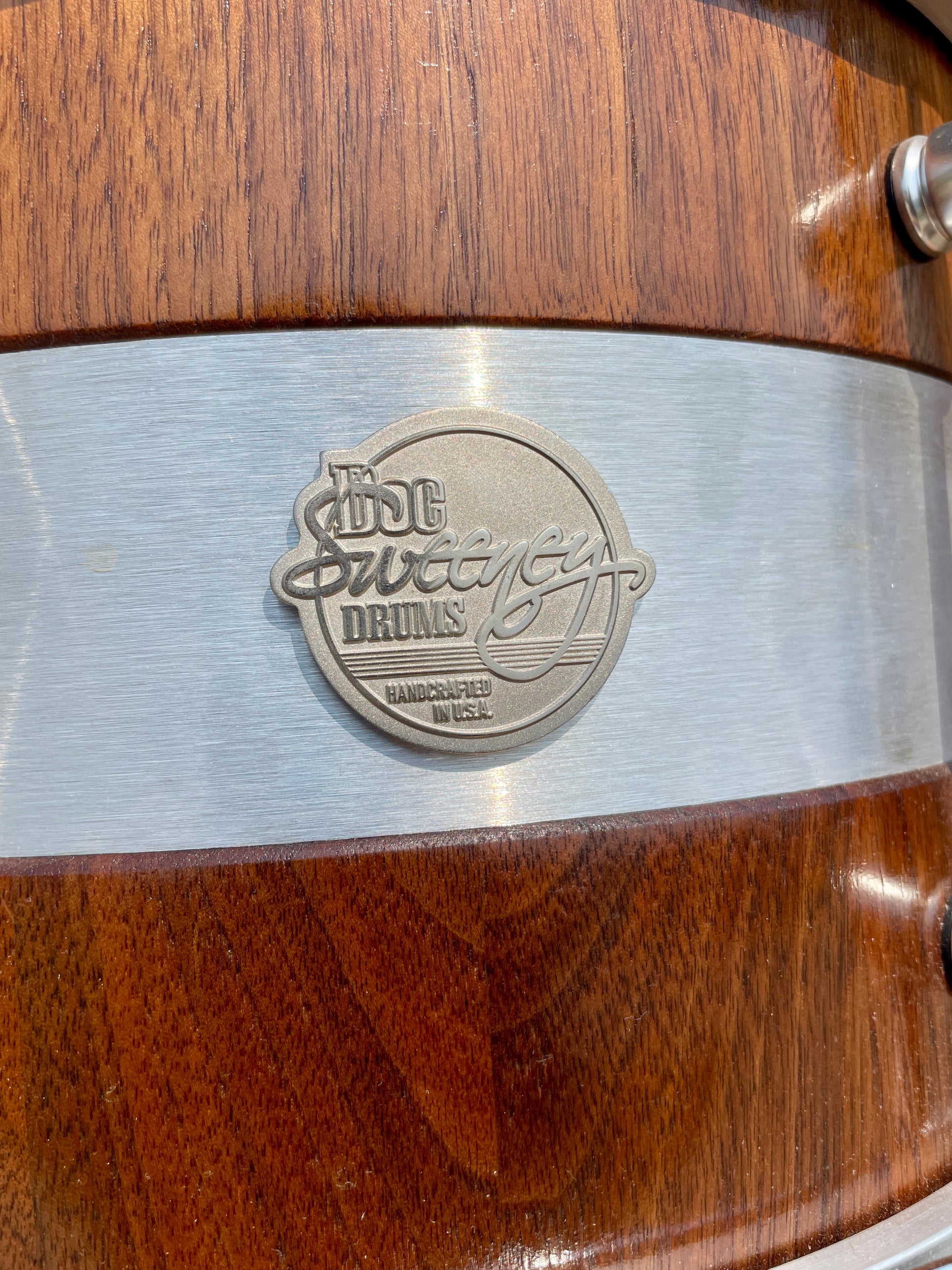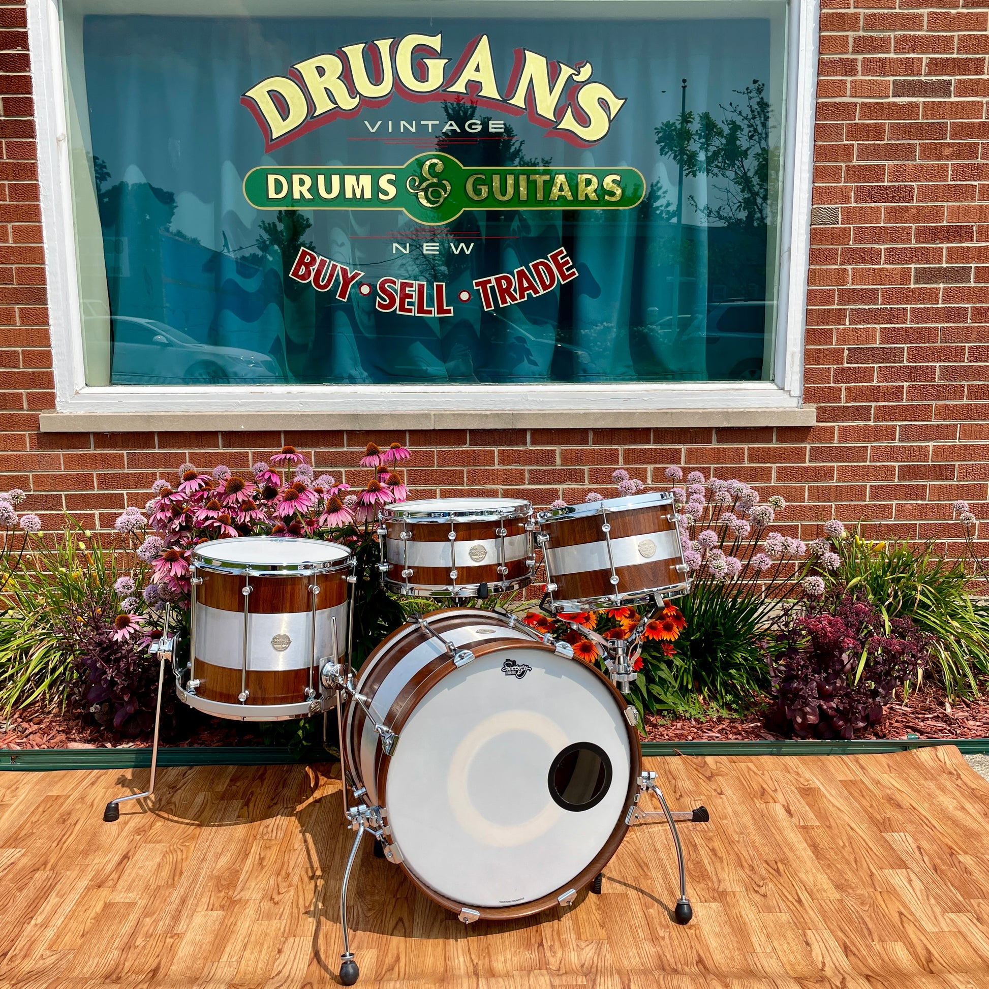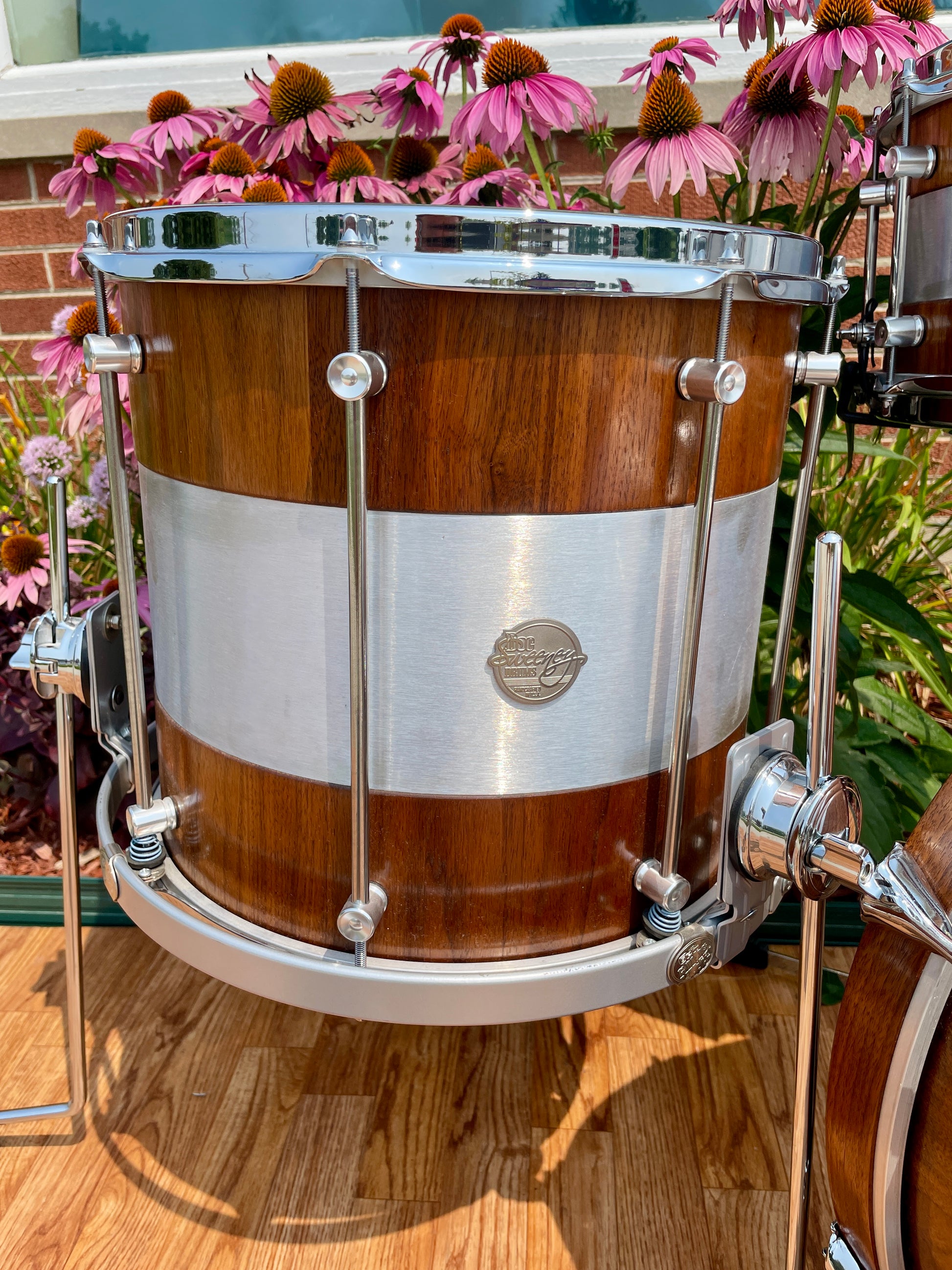 For your prime viewing pleasure is this fantastic Doc Sweeney Walnut RX2 with suspended aluminum rings RX drum set. It's in excellent well cared for condition with very light signs of wear. The RX2 series combines top and bottom rings of stave timber with an isolated center ring of rolled premium-grade aluminum. This set uses Walnut which pairs wonderfully with the aluminum to give these drums a sound that is articulate and present with a bright attack and rich low end. The proprietary tube lugs are milled from aircraft-grade aluminum, and all of the fasteners are stainless steel. The floor tom uses a suspension cradle to help maximize resonance. This set was $4995 new, so here's your opportunity to save a bundle on this high end stunner. It's a joy to play and would be equally at home in the finest of studios, stages, or drum collections. Enjoy!