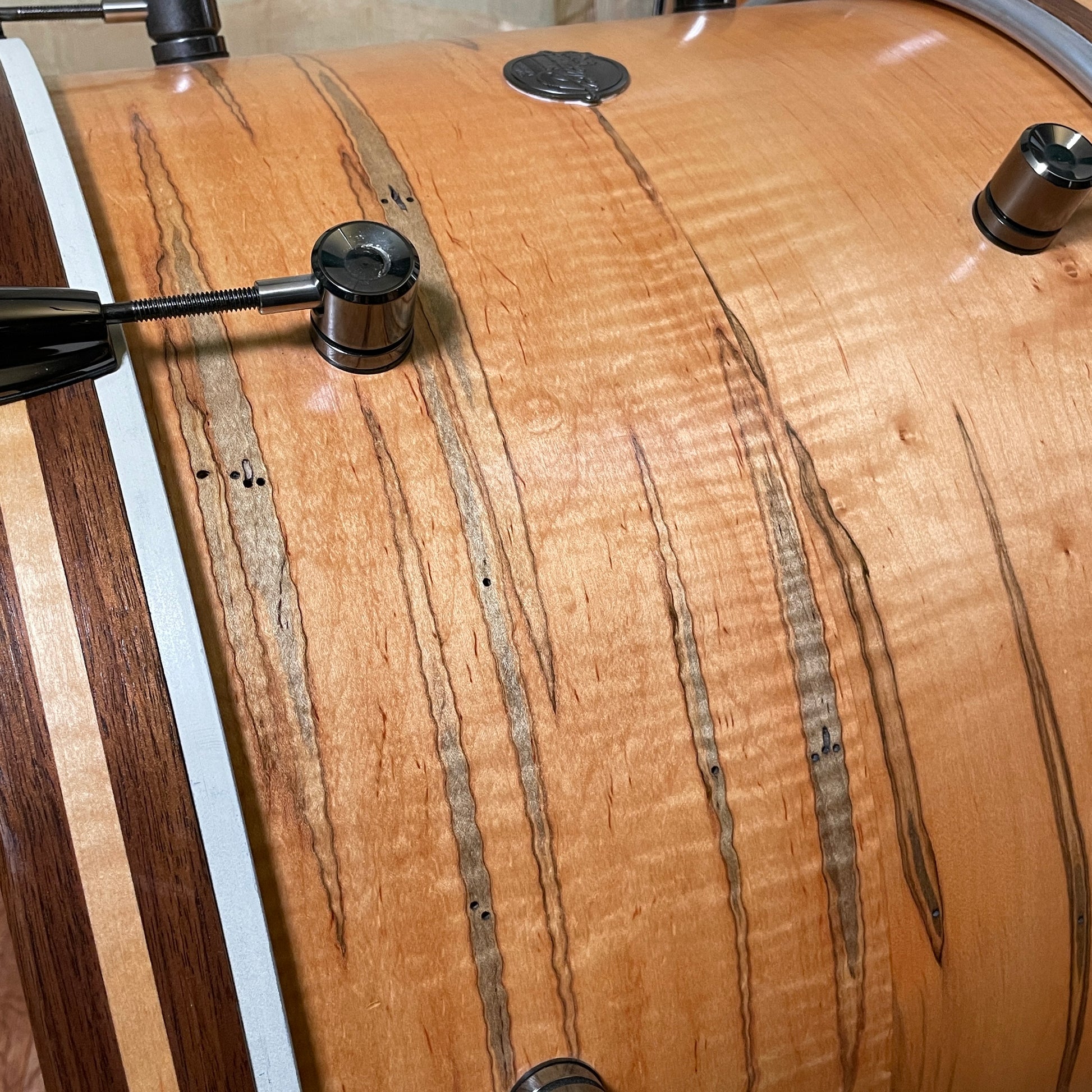Ambrosia Maple is a rare and unique hardwood. The gorgeous stain pattern found on this drum set is a result of ambrosia beetles boring into the wood of the tree. The beetles carry with them the ambrosia fungi, which then beautifully discolors the wood. Ambrosia Maple is also known as Worm Wood and is coveted for its use in furniture. As far as natural wood finish drum sets go, this kit is unique and truly extraordinary.