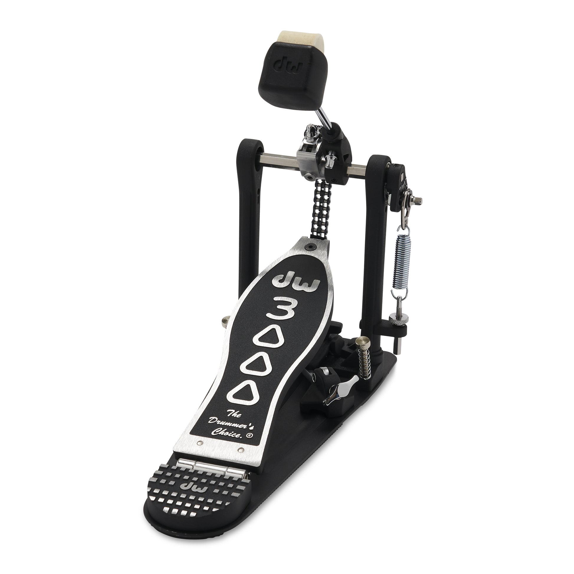 For over 50 years, DW has been the worldwide leader in hardware innovation. Every DW product launch has been followed with tireless innovation and the 3000 Series is no exception. The 3000 Series pedal offers innovative features and enhanced player functionality making it a smart, versatile choice for drummers of all skill levels and playing styles. Enjoy more features in the 3000 Series pedal than ever before. This all-metal, dual-chain single pedal has been updated with an Accelerator cam, adjustable footboard angle, and swivel toe clamp. The steel base plate also now features an anti-skid rubber mat for greater stability.
