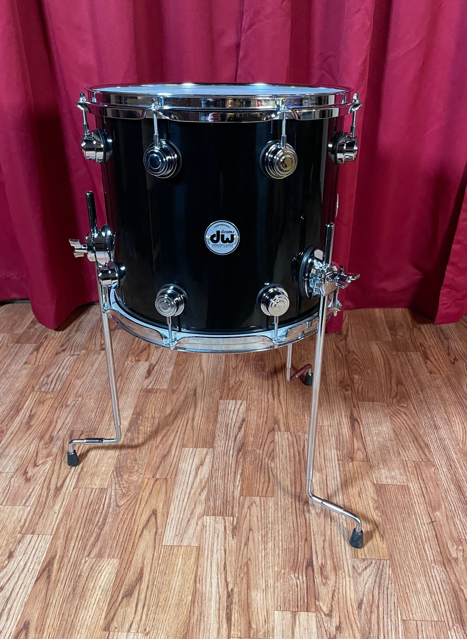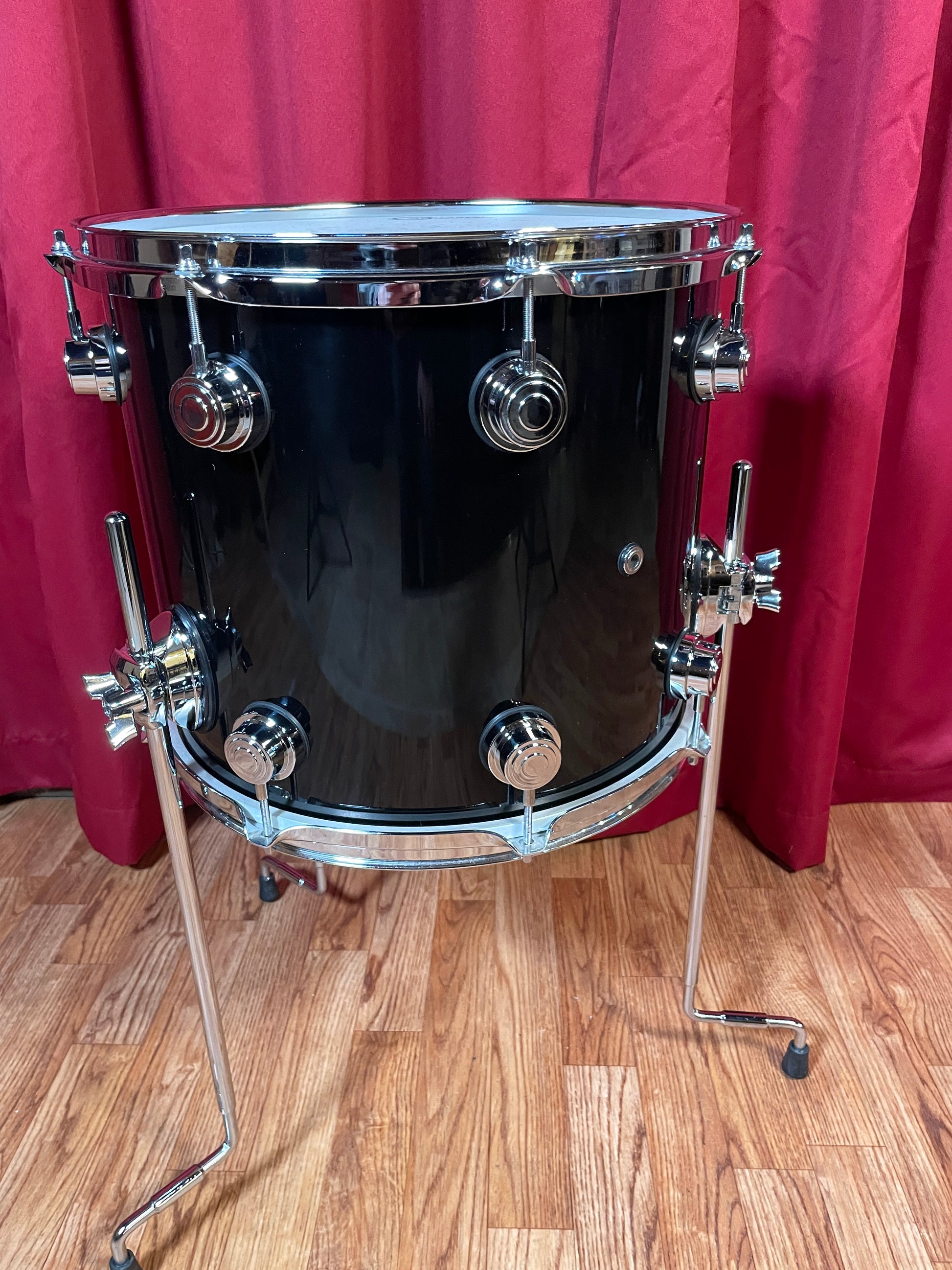 For your kind consideration is this DW Collectors Maple 12x14 floor tom in Piano Black. It's in excellent condition and tunes up beautifully. This is a maple X-shell where the veneers were cut at a 45-degree angle and cross-laminated in an X pattern. This allows for both low frequency ranges and shell strength to be accomplished. Features chrome triple flange hoops and the original 21" legs. Enjoy!