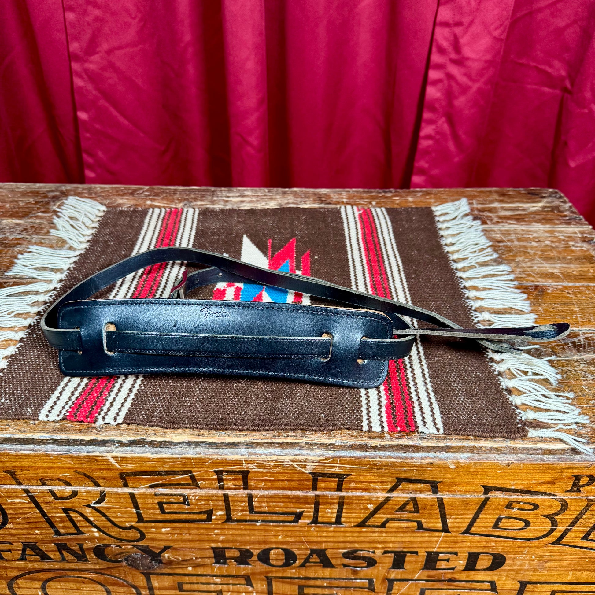For your kind consideration is this lightly used and well cared for Fender Super Deluxe Vintage-Style leather guitar strap. Very classy design, excellent choice for any Fender lover who wants that vintage look. No snags, no marks, and the ends are in great condition. Maximum length is around 57". Enjoy!