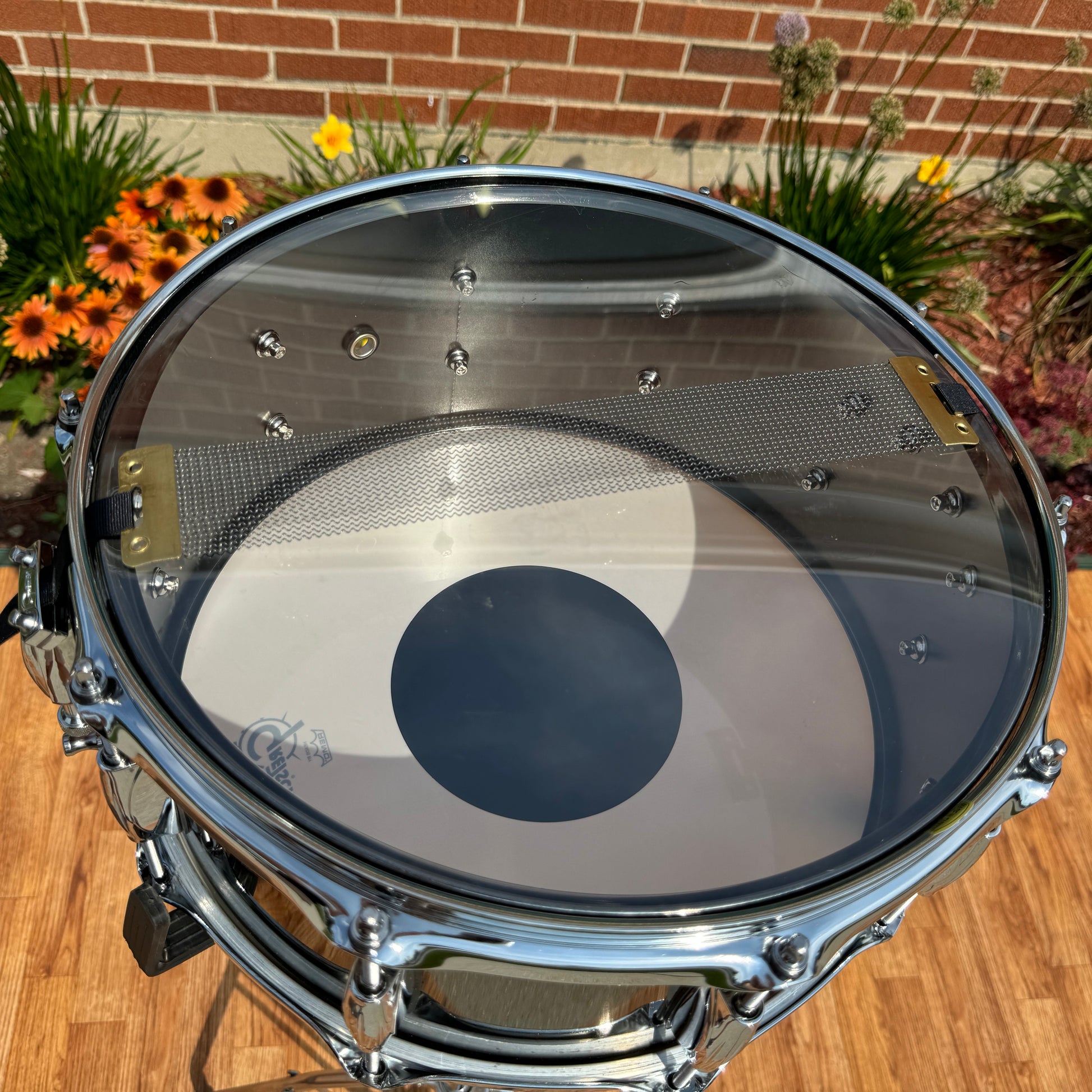 For your kind consideration is this Gretsch 6.5x14 Full Range snare drum. This black nickel over steel snare drum is in mint condition with minimal signs of use on the original heads and sounds fantastic. It's all original down to the wires. It offers an ideal balance of power, sensitivity, beauty, and value all in one snare drum. Taking advantage of its wide tuning range, you can achieve either a loose, slow and dry sound character or a very sharp, bold and bright attack. It features 2.3mm Triple flanged hoops, an adjustable throw-off, 20 strand snare wire, Remo® drum heads, and 45 degree bearing edges. Why pay $269 for a brand new 6.5x14 Gretsch Full Tone snare when you can get this barely used one for a great price. Enjoy!