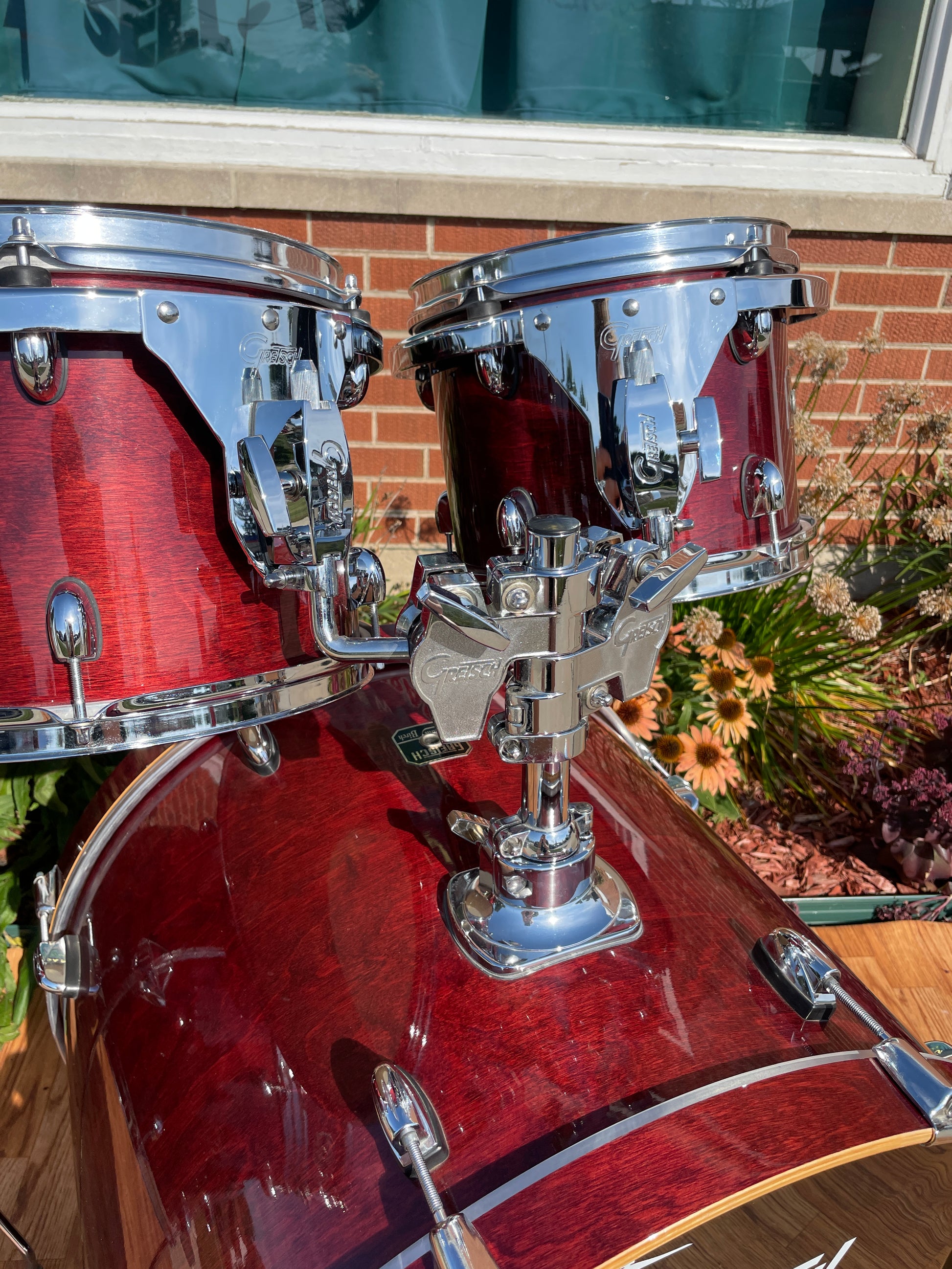 For your kind consideration is this sweet Gretsch Catalina Birch drum set in Dark Walnut from the mid-2000s. This set is in overall great condition with some marks here ad there as expected, but no major bumps or dings. The Catalina Birch series features 6-ply 100% birch shells with 45 degree bearing edges that deliver great high end attack with great low end making them suitable for a variety of genres and playing styles. The rack toms both have their original GTS suspension mounts and the double tom holder is included. The matching 5x14 snare drum is also in great condition and the strainer operates smoothly. All of the drums tune up with ease and have all the punchy tone you could ask for from a birch Gretsch set. Enjoy!