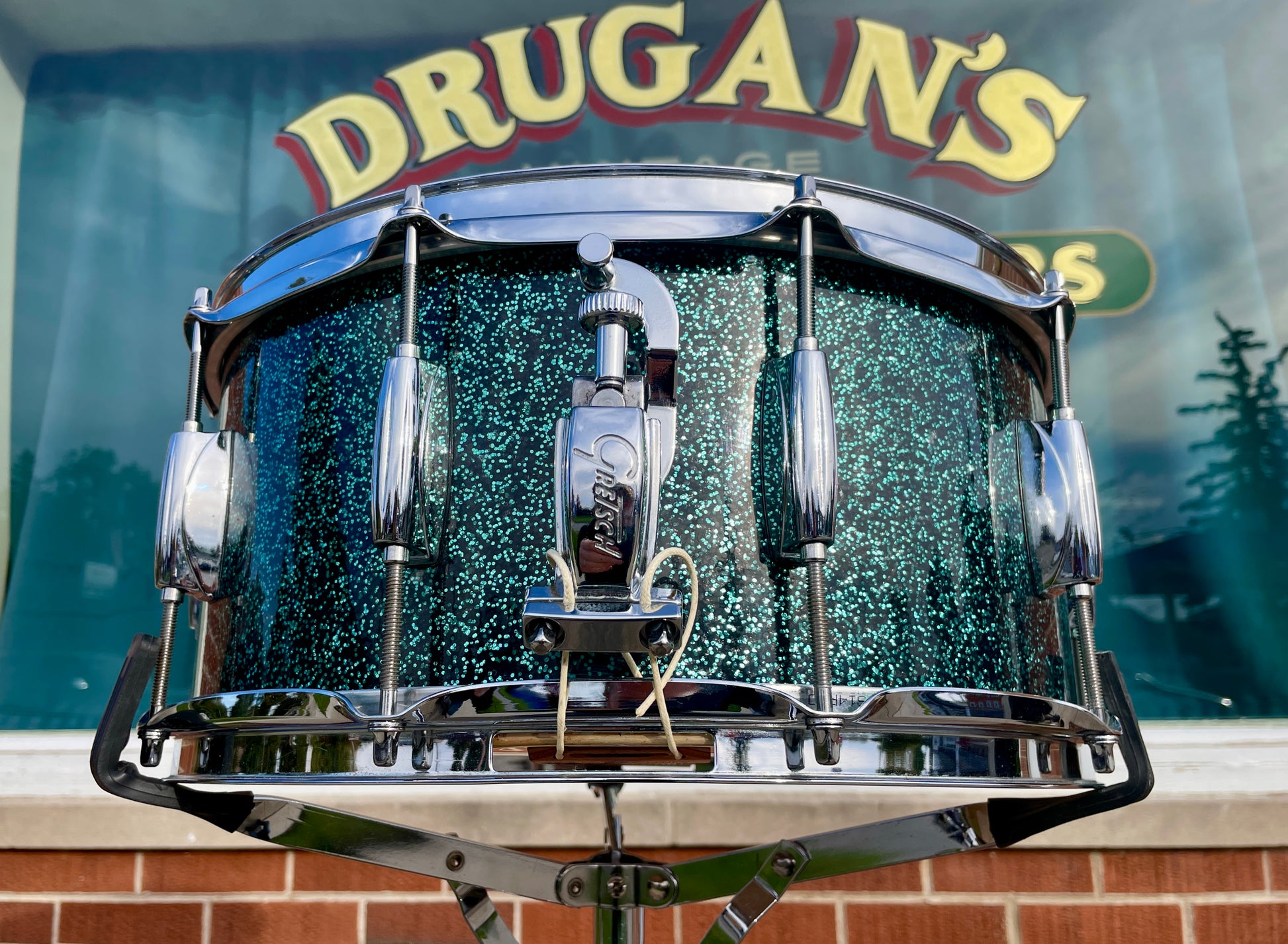 For your viewing pleasure is this sweet Gretsch Catalina Club 6.5x14 snare drum in Ocean Twilight. This 10-lug snare is in excellent well cared for condition. It's built using the Gretsch 7-ply Mahogany Formula shell with 30 degree bearing edges. The hardware is in great condition and the throw off is fully functional with a nice set of Puresound wires. Most importantly, it tunes up with ease and has That Great Gretsch Sound. Enjoy!
