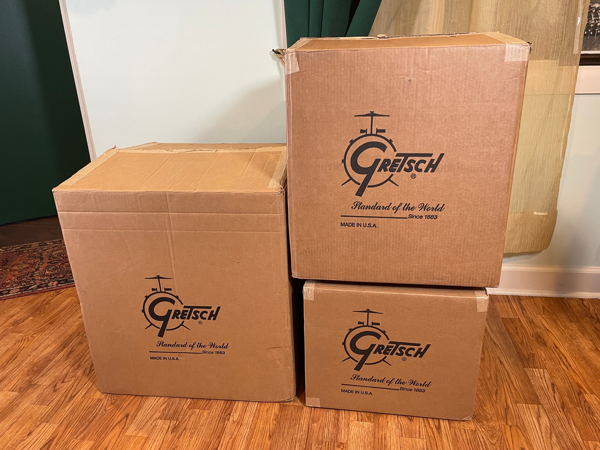 For your optimum viewing pleasure is this breathtaking Gretsch USA Custom drum set in a fabulous factory custom build. Custom order vintage features include 12" deep x 18" bass drum size, bass drum T's and claws, dual Pratt bass drum mufflers, dual mufflers on both toms, rail consolette mount, and hinged diamond bracket floor tom brackets. This set has all original heads with just a few marks from tuning. Comes with all original boxes, and is in like-new condition. The quintessential jazz set, enjoy!