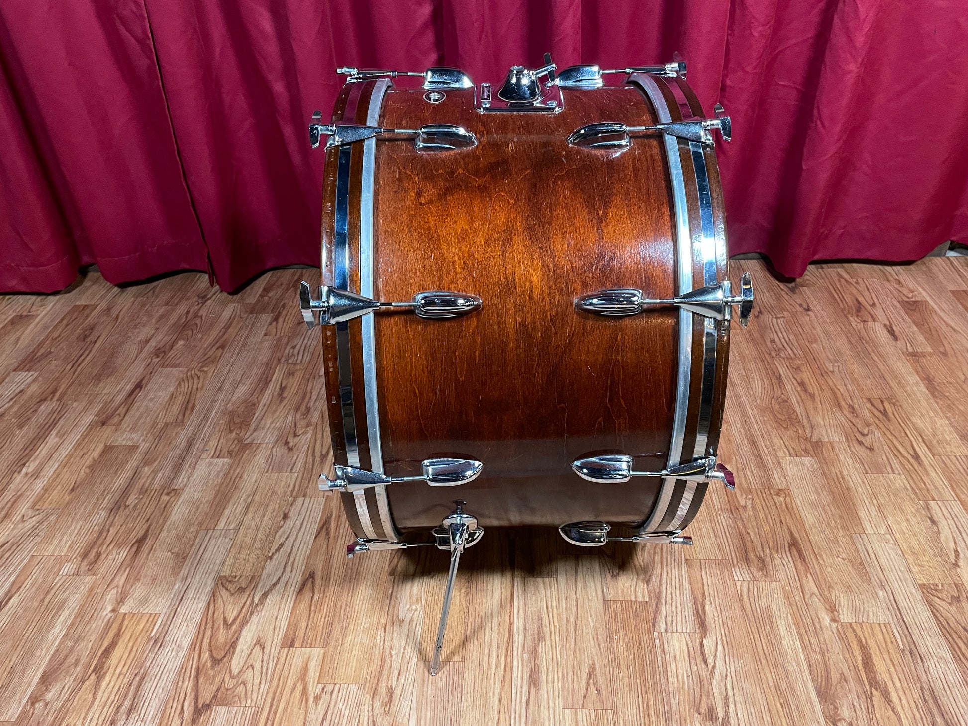 For your kind consideration is this vintage Slingerland 14x24 Sound King bass drum from the mid-1970s. This drum has a gorgeous walnut finish with matching walnut hoops and chrome inlay. There is one panel with wear on the clear coat as shown in the pics that can't be seen when the bass drum is set up and some other smaller spots here and there. It has the original spurs and tom mount which function properly, as well as the original T's and claws. The original silver & black Niles badge is nice and tight. The edges are true and original and th re-rings are in excellent condition. There are no extra holes or modifications. Most importantly, the drum tunes up easily and sounds thunderous. Enjoy!