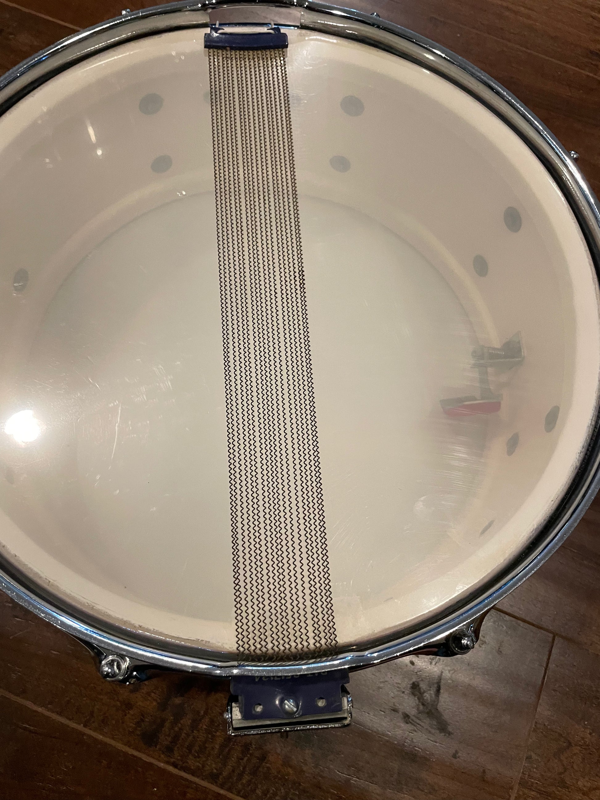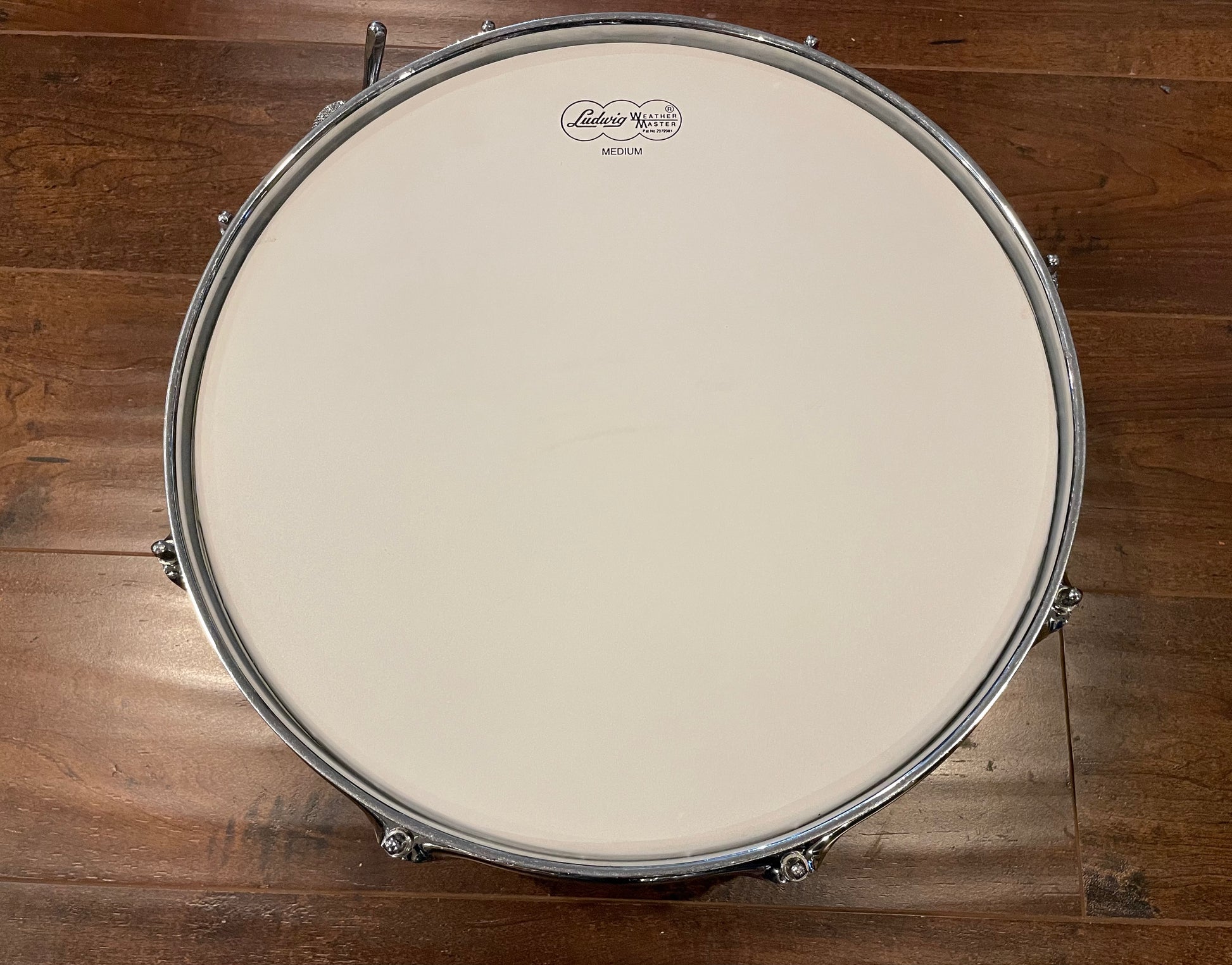 For your extreme viewing pleasure is this lovely vintage Ludwig No. 900P Super Classic 5.5x14 snare drum in scarcely seen Black Galaxy Sparkle wrap. This early '60s drum has a pre-serial keystone badge and no internal date stamp on the clean white interior. The wrap is in good condition with some pinks still visible, while the greens have mostly faded. This one was ordered with upgraded chrome hardware that still shines beautifully with very little aging. The original chrome over brass triple flanged hoops are in excellent condition. This transition era drum has a chrome WFL Classic P-87 throw-off that operates smoothly and a Ludwig script butt plate. The red baseball bat muffler operates smoothly as well. No extra holes or modifications. Nice Ludwig Weather Master Medium coated head on top, Ludwig Snare side head on bottom, and original 18 strand wires. Seize the moment on this rare drum, they don't pop up often. Enjoy!