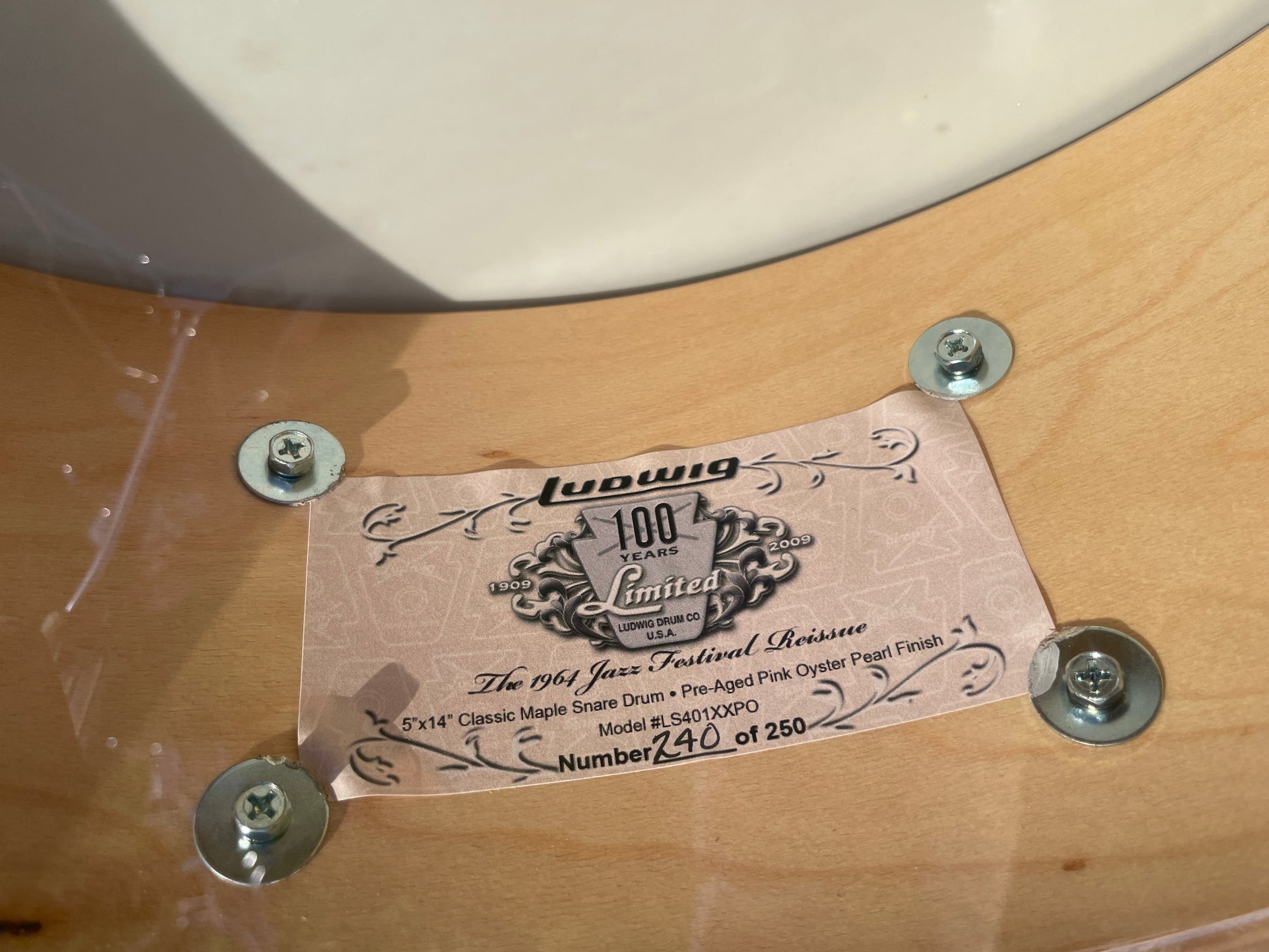 N.O.S. Ludwig Classic Maple 5x14 100th Anniversary 1964 Jazz Festival Reissue Snare Pre-Aged Pink Oyster Pearl #240