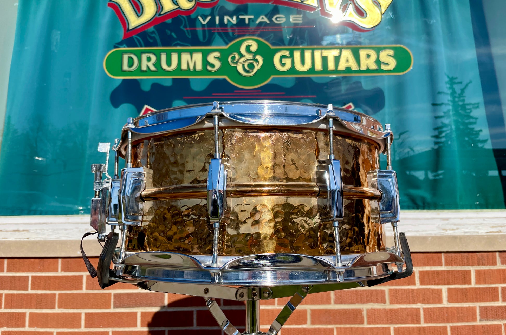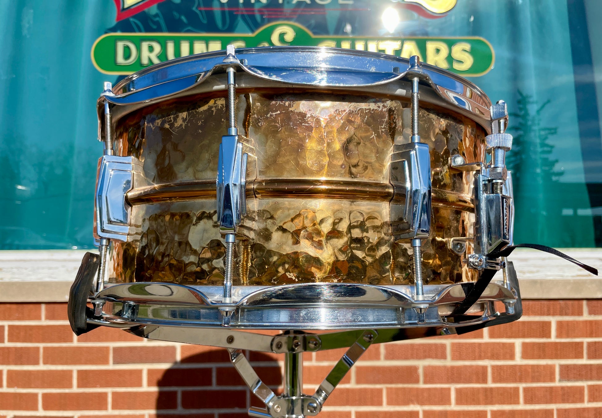 For your extreme viewing pleasure is this fabulous Ludwig 6.5x14 Hammered Bronze Phonic snare drum from the 1990's. This well cared for gem features a hammered bronze shell, imperial lugs, 10-lug steel hoops, Ludwig strainer, and Ludwig wires. The heads are Remo Ambassador and are in great condition. It's in beautiful condition with some normal oxidation of the bronze. Most importantly it tunes up with the greatest of ease and sounds beyond fantastic. Enjoy!