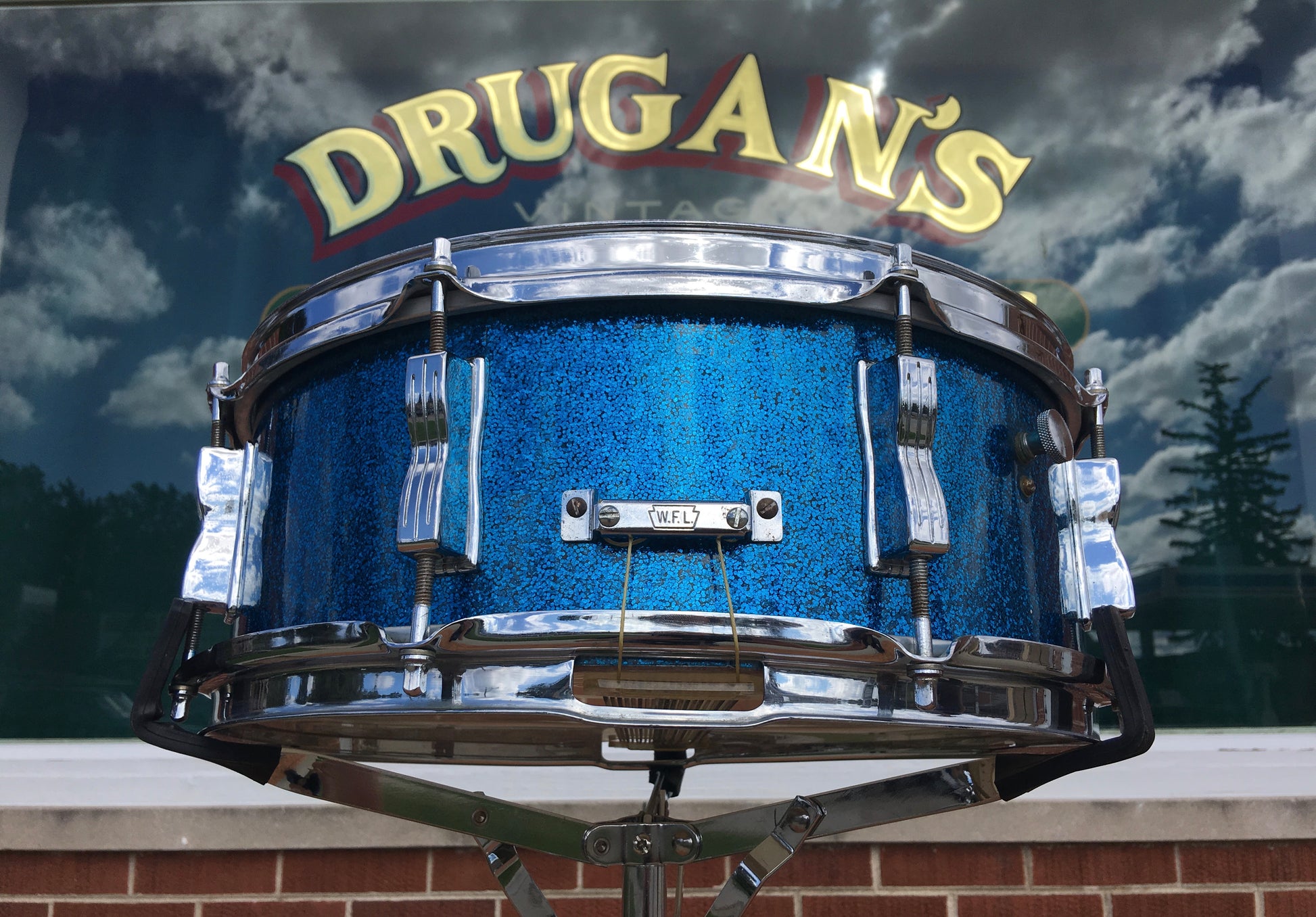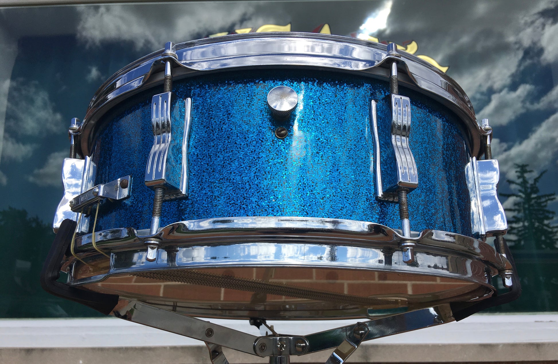 For your viewing pleasure is this excellent example of an early '60s 5"x14" Ludwig Jazz Festival snare drum in stunning blue sparkle. It is in wonderful condition with minimal handling wear. There is a very light scuff located two panels to the right of the strainer that is difficult to capture in pictures. It features a gorgeous pre-serial # Keystone badge, nice chrome-over-brass hoops, small round knob muffler, correct WFL P-83 strainer & butt & earlier heavy bow-tie lugs. All tension rods and washers are original. The chrome is in great condition with little to no pitting. This drum still has the original Ludwig Weather Master head on the bottom and original snare wires. There are no extra holes or modifications of any kind. It displays wonderfully and would be equally at home among the finest of collections, studios, or stages. It tunes up like a champ and is pure sonic bliss to play! Enjoy!