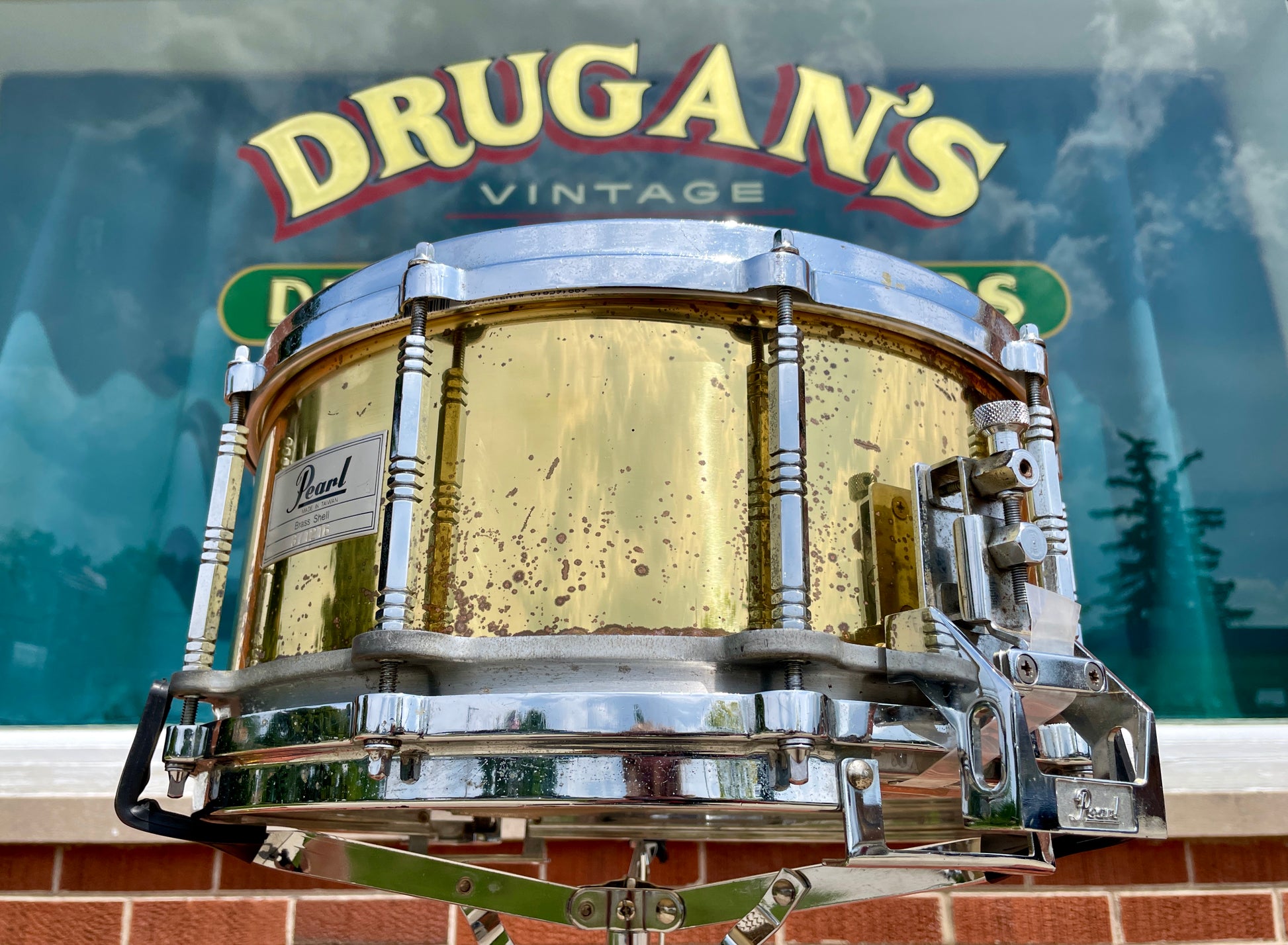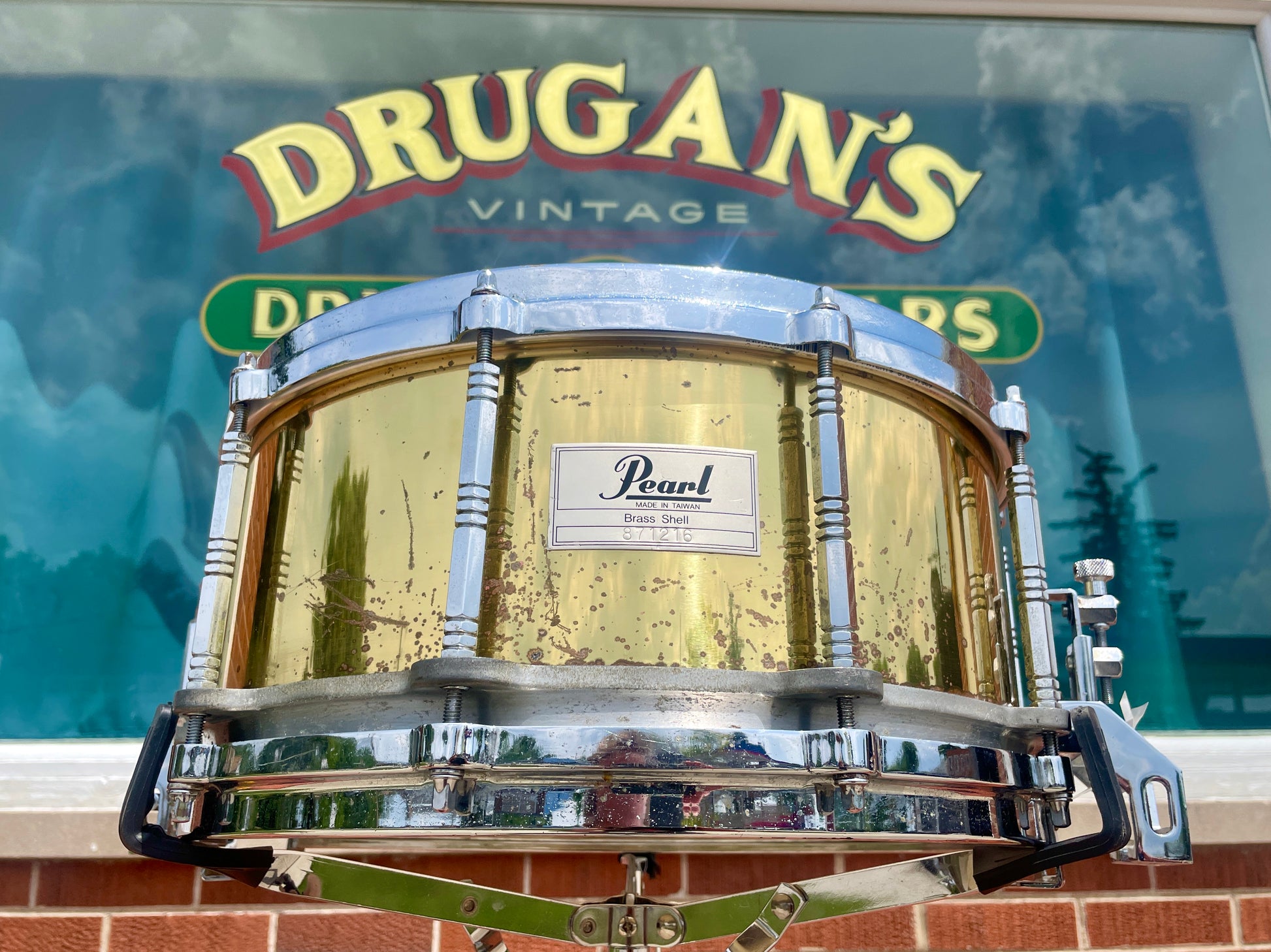 For your kind consideration is this 1980s Pearl B-914D Brass Free Floating Snare Drum. It shows the signs of age and gigging with some tarnish on the shell and some pitting on the hoops. That doesn't effect the sound though and this one sounds as awesome as the day it was made. These first appeared in the 1985 Pearl catalog and has the first generation hex free floating lugs. The brass snare drums produce the uniquely beautiful blend of tone color and powerful projection. From a sensitive response to the most powerful back beat, your mood is faithfully reproduced. The S-011 strainer is fully function. This is a great players grade, vintage Pearl snare to add to your collection. Enjoy!