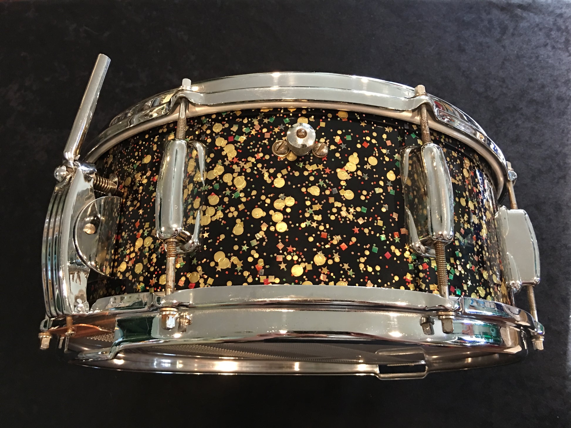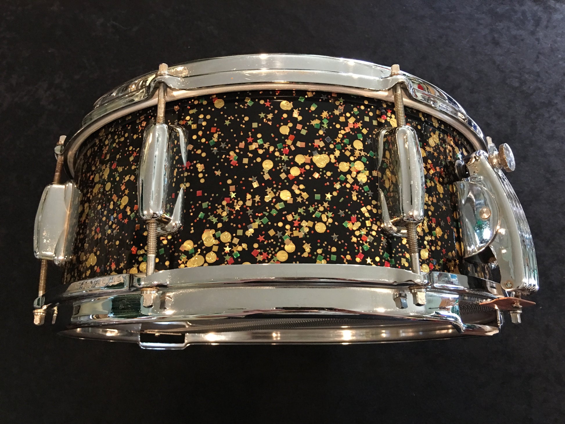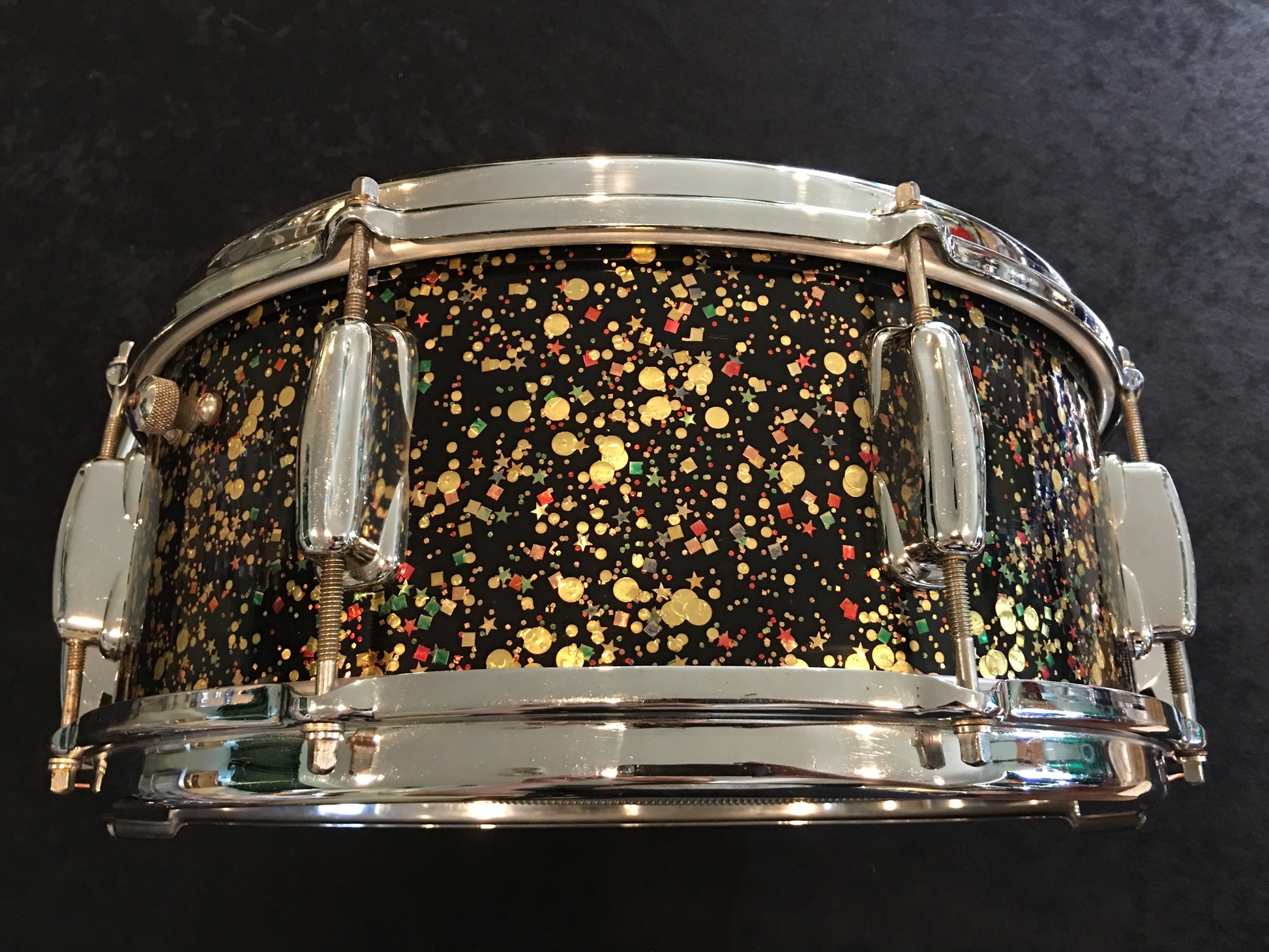 For your viewing pleasure is this supremely beautiful and rare 1962 Slingerland solid shell Super Gene Krupa 5.5x14 snare drum in dazzling Mardi Gras finish. We have owned other Slingerland snares and drum sets in this finish (as well as Rogers drums in Mardi Gras), and can tell you without hesitation that the batch of wrap used on this beauty is the most densely populated Mardi Gras wrap we have ever laid eyes on. Lucy Ricardo and Ethel Mertz must have been working the conveyor belt at the wrap factory that day and were really getting wild with the confetti. Simply stunning!