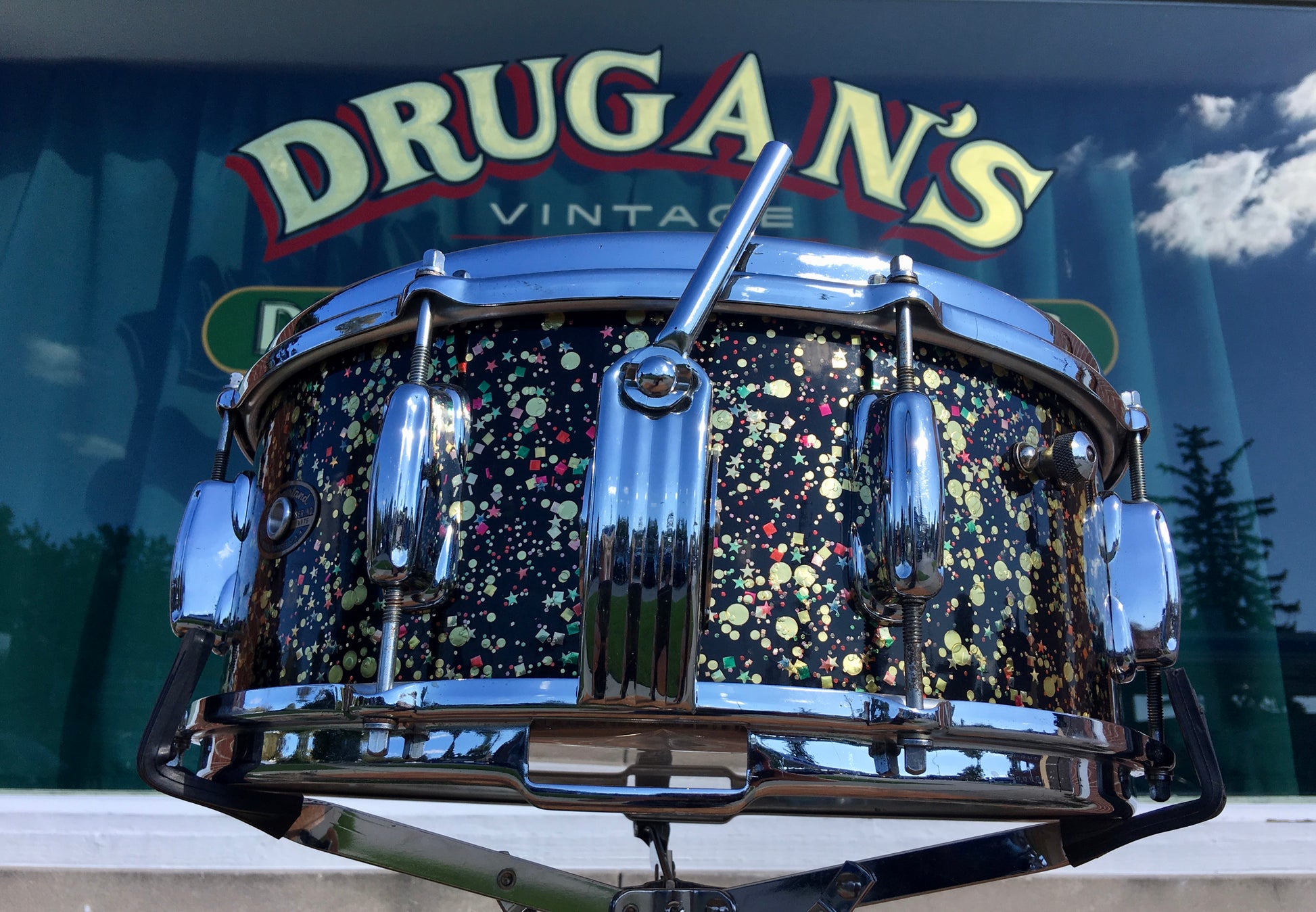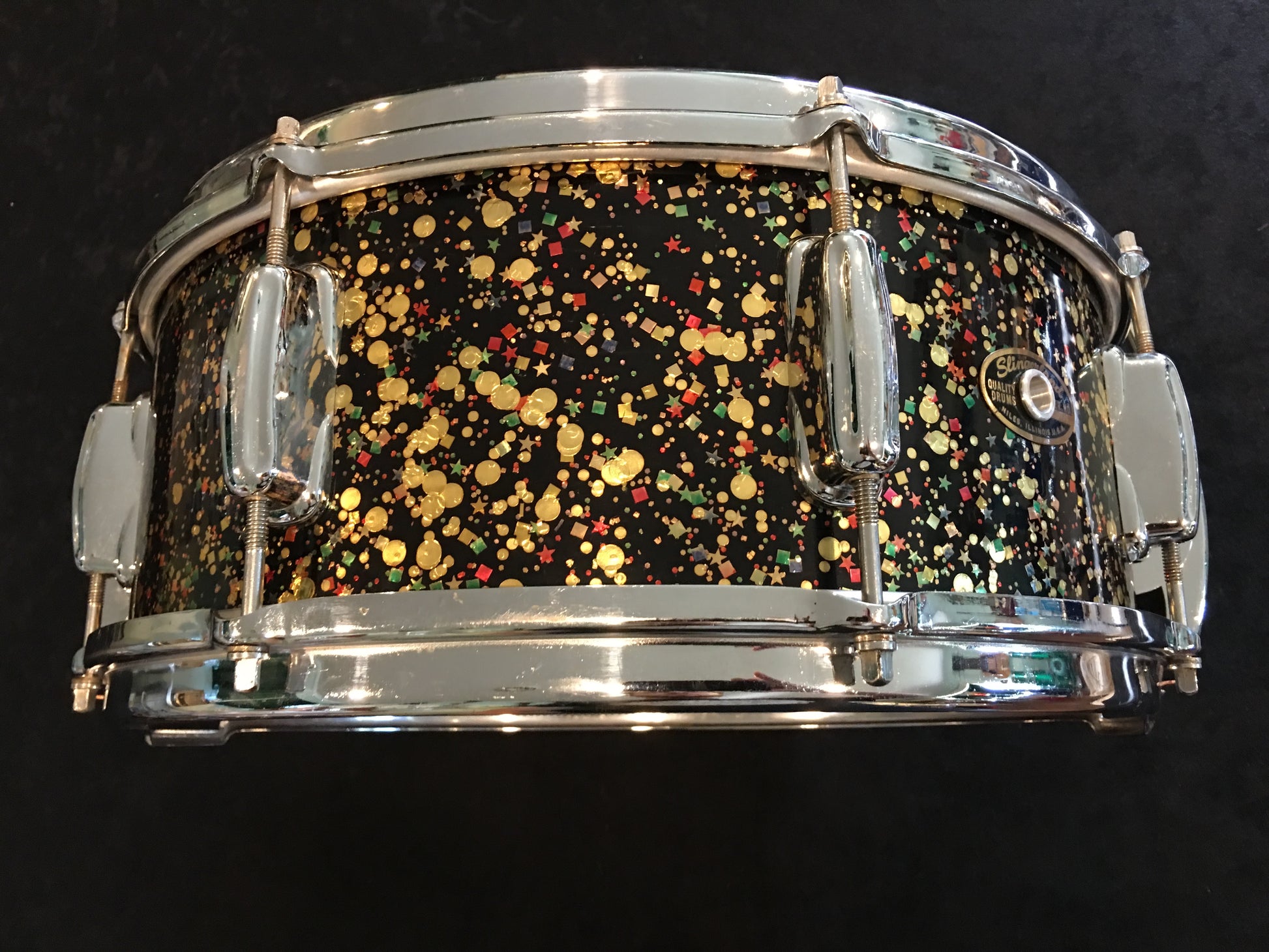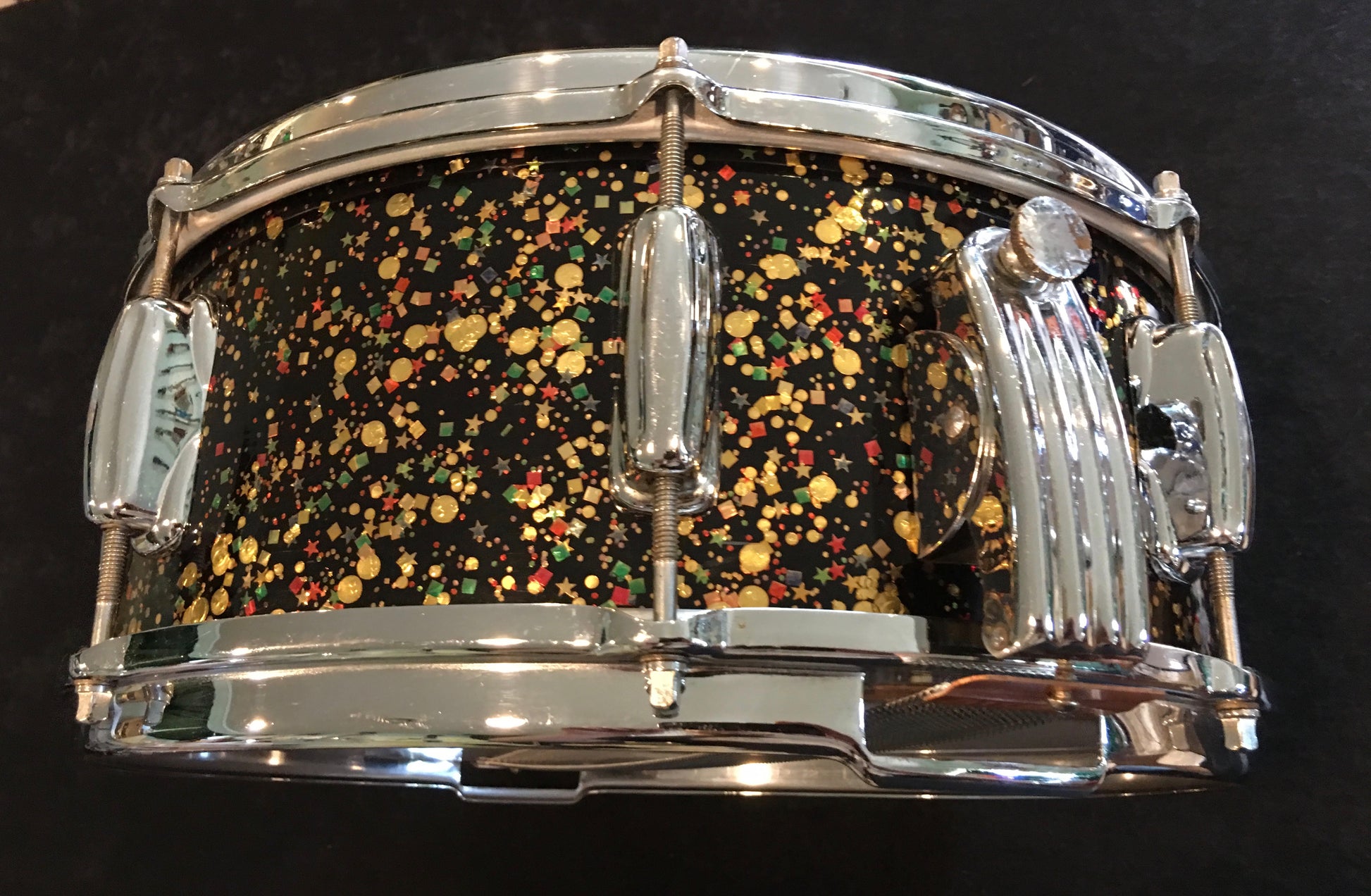 For your viewing pleasure is this supremely beautiful and rare 1962 Slingerland solid shell Super Gene Krupa 5.5x14 snare drum in dazzling Mardi Gras finish. We have owned other Slingerland snares and drum sets in this finish (as well as Rogers drums in Mardi Gras), and can tell you without hesitation that the batch of wrap used on this beauty is the most densely populated Mardi Gras wrap we have ever laid eyes on. Lucy Ricardo and Ethel Mertz must have been working the conveyor belt at the wrap factory that day and were really getting wild with the confetti. Simply stunning!