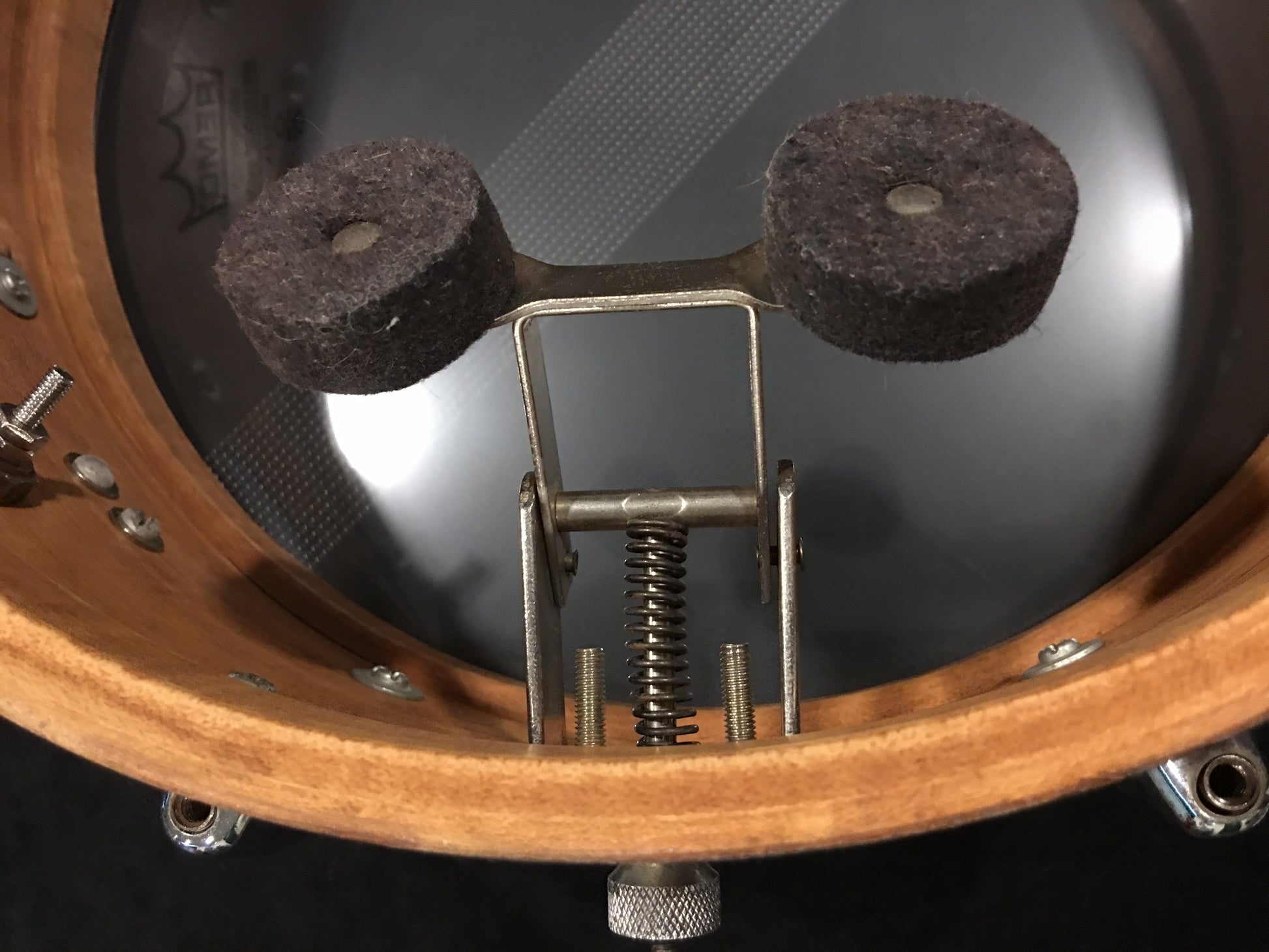 There are no extra holes, and the drum is in excellent condition with no scratches, or puckering of the wrap. The seam is flat and tight. The strainer and butt assembly both work as intended, as does the muffler. The very early four digit black and brass Niles badge looks great and is nice and tight. The maple interior is a bit darker than we have seen in the past, but it is indeed a solid maple shell (see pics). A couple of the tension rods are replacement Slingerland rods, and are a slightly different length. All of the chrome is nice and presentable, although there's a little bare brass on the tensioning knob on the butt plate assembly. Both hoops are chrome over brass. In true solid shell Radio King fashion, Remo heads fit ever so slightly snug. The edges are true and original.