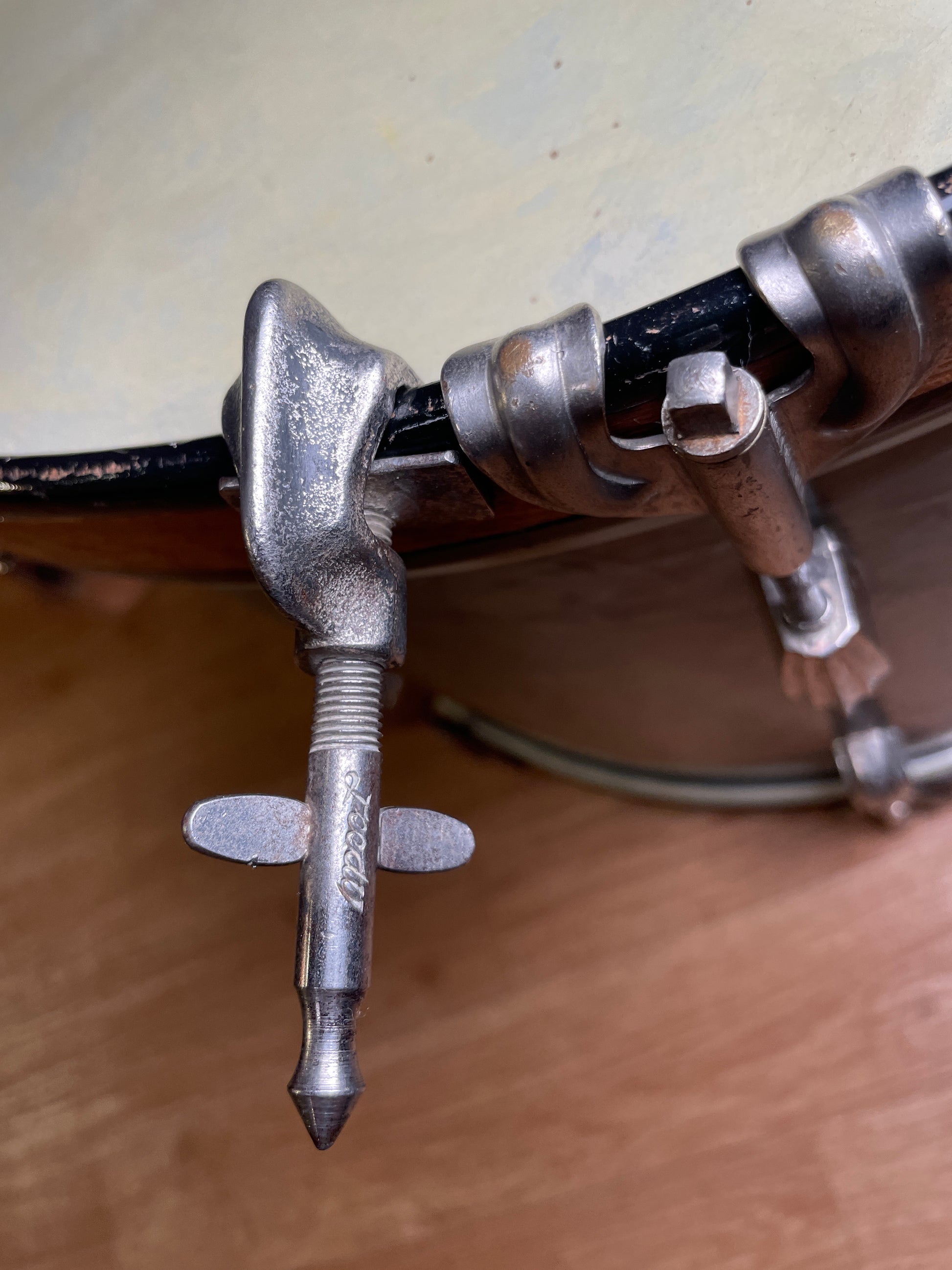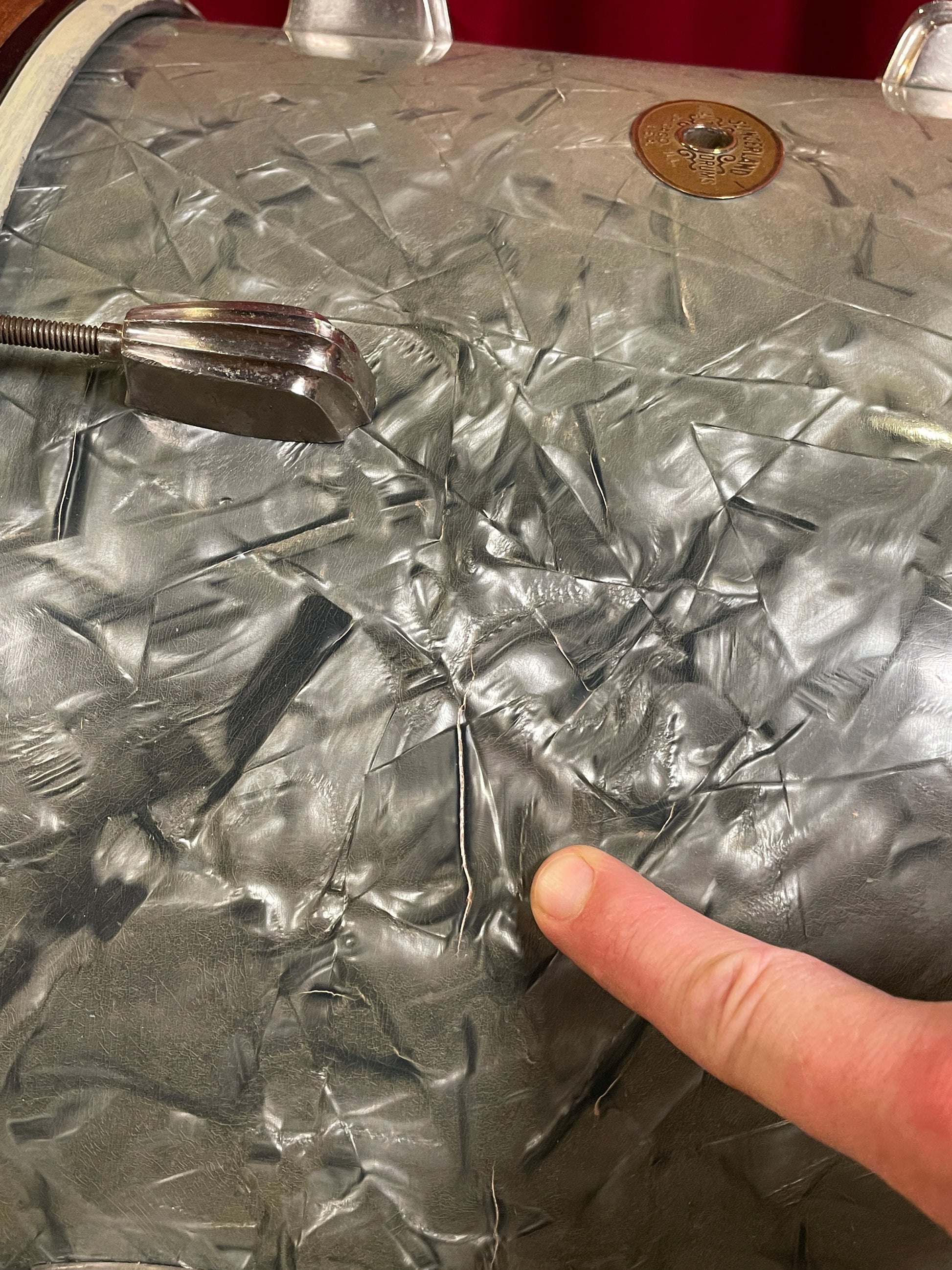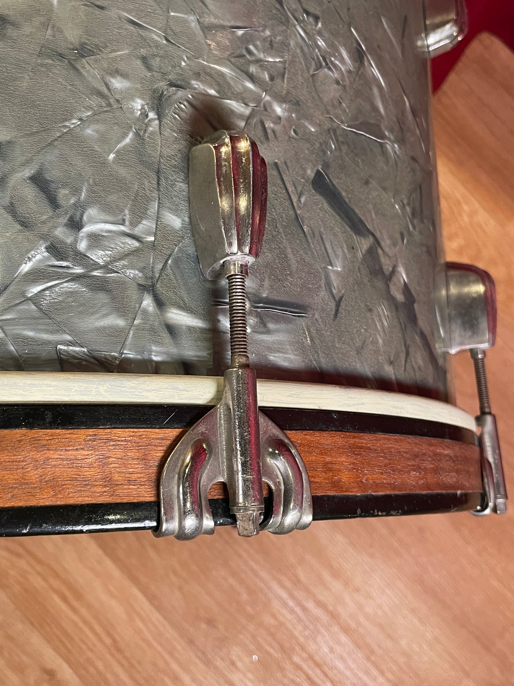For your kind consideration is this vintage Slingerland 14x18 tenor bass drum in rare Blue Diamond Pearl finish. This color is cited by Rob Cook in "The Slingerland Book". It is described by Slingerland historian & expert Mark Cooper that "around 1947-1949, a unique light blue-ish gray version of Black Diamond Pearl appeared for a while. This was just a 'limited run' color variation from the Pyralin manufacturer and was not listed as a separate finish from Black Diamond Pearl. This odd and beautiful variety can also be seen on some post World War II drums." The badge dates this drum to late 1947-1950. It's in great condition aside from a few cracks in the wrap and one piece of wrap missing under the hoop, shown in pics. The modern heads were painted to look like old calfskin heads. Most importantly it tunes up with ease and sounds fantastic. Comes with two vintage Leedy hoop mount spurs. Truly a beautiful and great sounding piece of Slingerland history. Enjoy!
