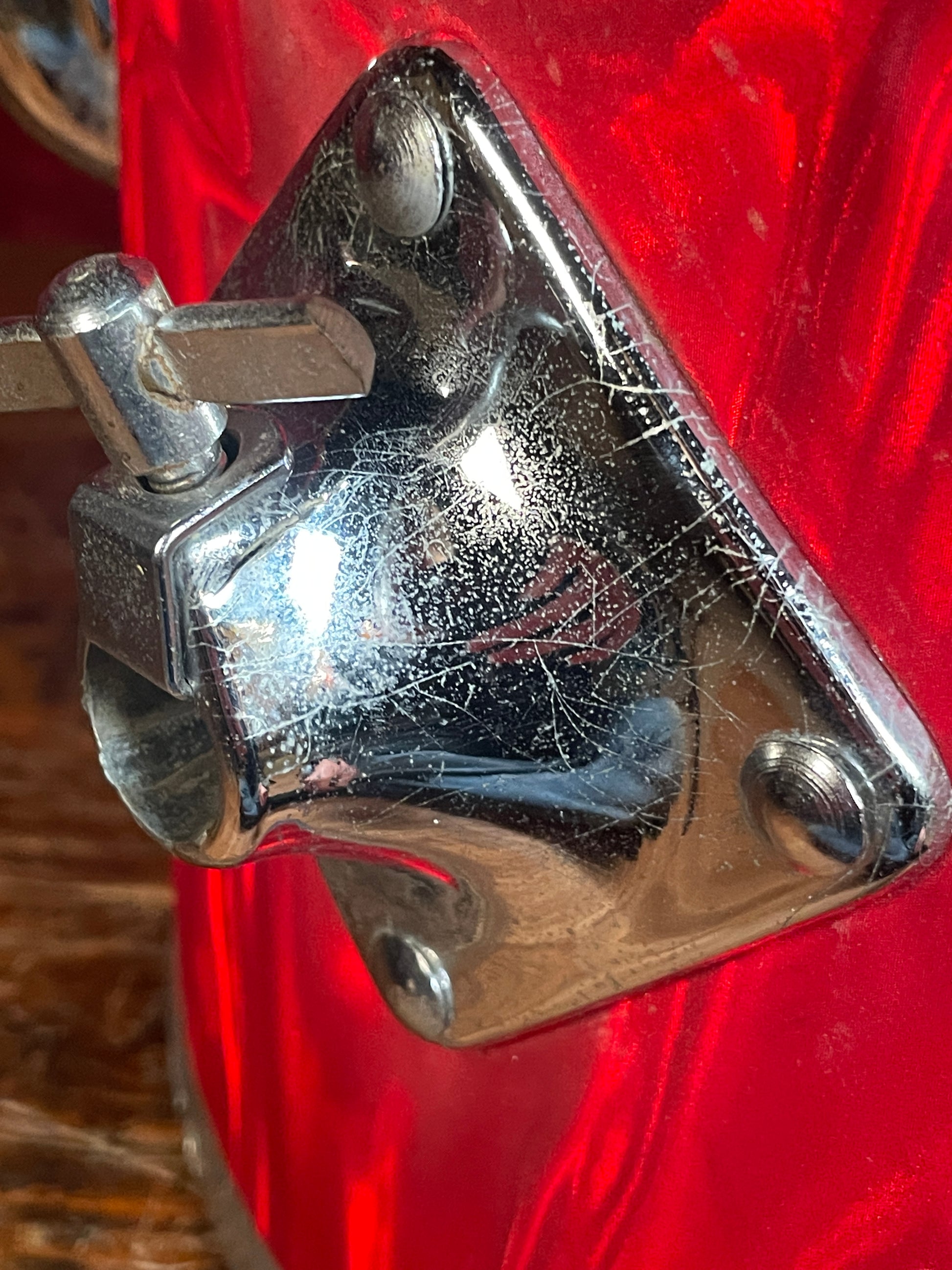 For your kind consideration is this vintage Slingerland 9x13 concert tom. The red satin flame wrap has lots of psychedelic shimmer along with some scuffs and wear. The 3-ply shell is solid and the bearing edges are in very good condition. Hoops have minimal wear and the original small lugs have just a bit of tarnish. Only issue is the mount has a little crack as shown in the photos which does not affect the functionality. Enjoy!