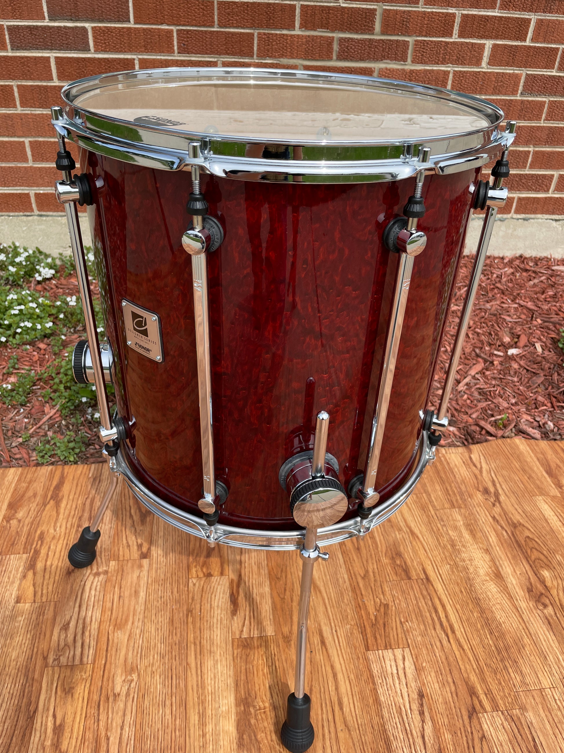 For your kind consideration is this 16" Sonor Designer Series floor tom in Stain Red. It's in nearly new condition and displays beautifully. All original aside from the top head. This tom has been waiting to complete your set. Most importantly it tunes up with the greatest of ease and sounds fantastic. Enjoy!