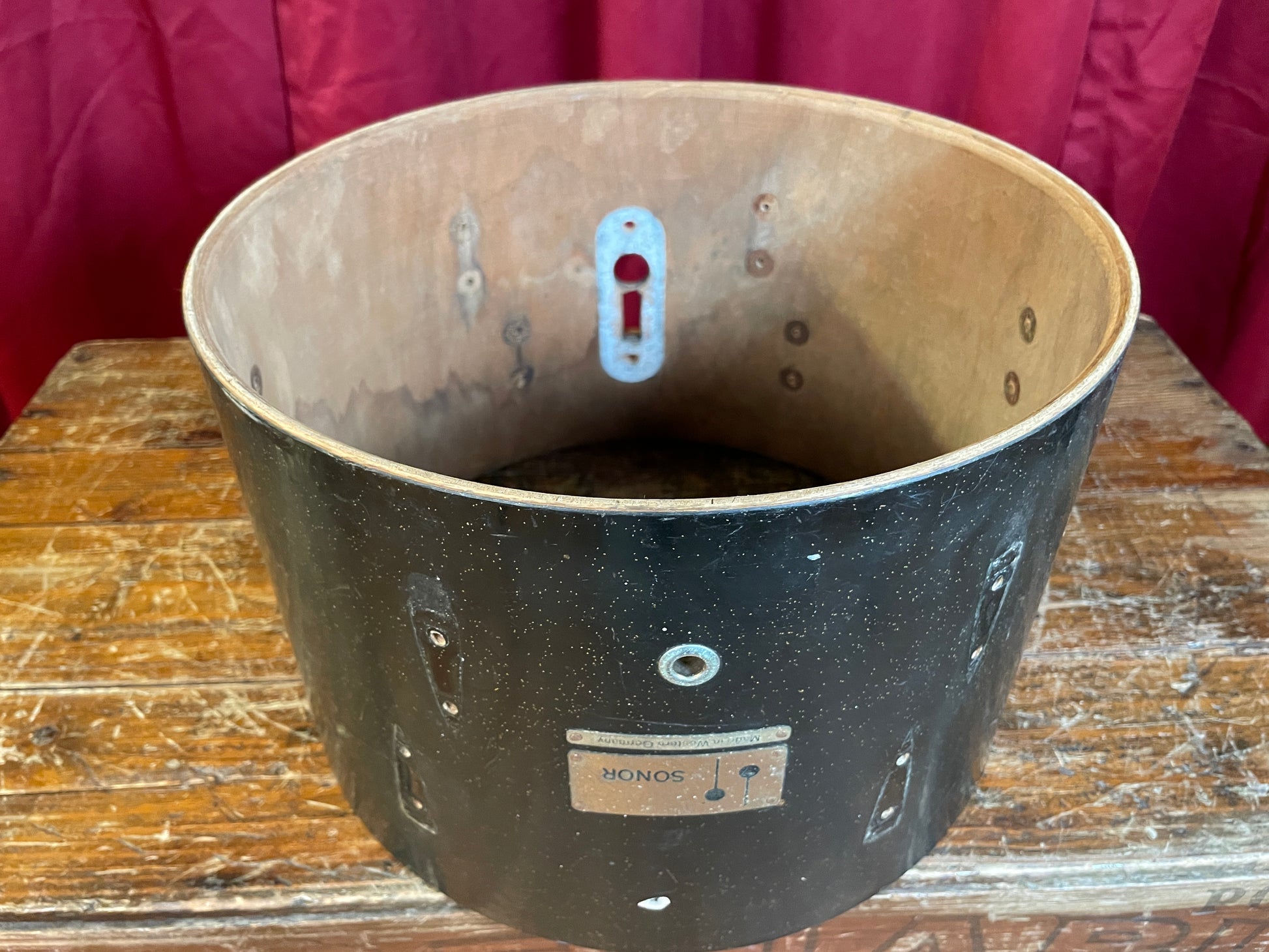 For your kind consideration is this 1971 Sonor Teardrop 8x12 tom shell. The actual diameter measure 30cm as was standard for these drums at the time. Modern 12" drum heads fit well. The lightly faded black silver speckle finish has scratches and a patch of rash. Like the matching 16" floor tom, this tom some water damage and the top bearing edge is a little rough. See photos for a detailed look. If you're looking for a cool vintage Sonor restoration project, these are a great option. See our listing for the matching floor tom. Enjoy!