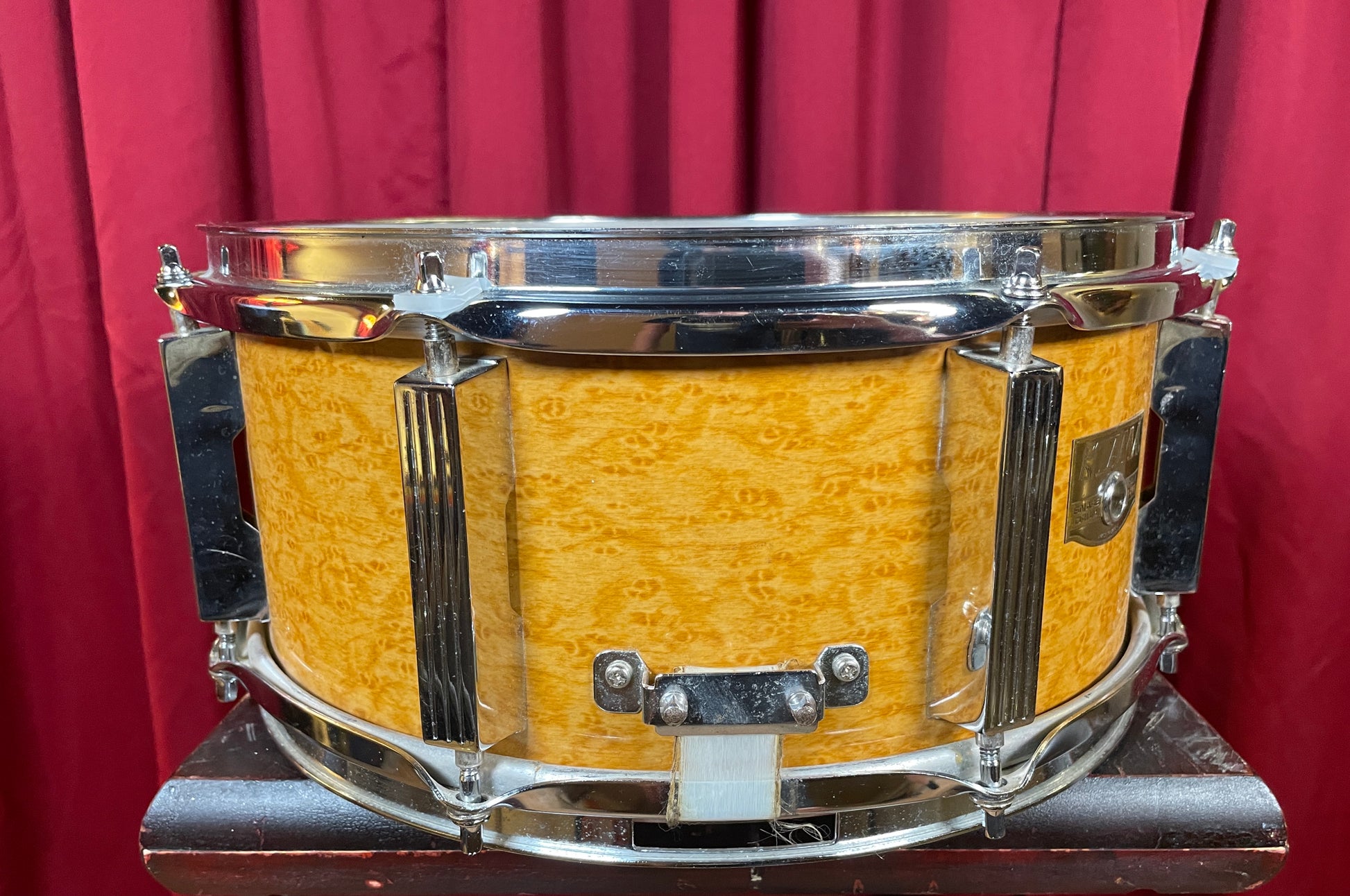 For your kind consideration is this Tama Artwood 6x13 soprano snare drum in a beautiful Amber Gravure wrap over a 7-ply 9mm birch shell. Original Sure-Tune long lugs, Power Action strainer, and steel hoops. Original bottom head, original wires with a couple of strands missing, changed top head. Fantastic sounding drum that doesn't come up for sale too often. There are no extra holes or modifications and the bearing edges are true and original. Most importantly it tunes up with the greatest of ease and sounds fantastic. Enjoy!