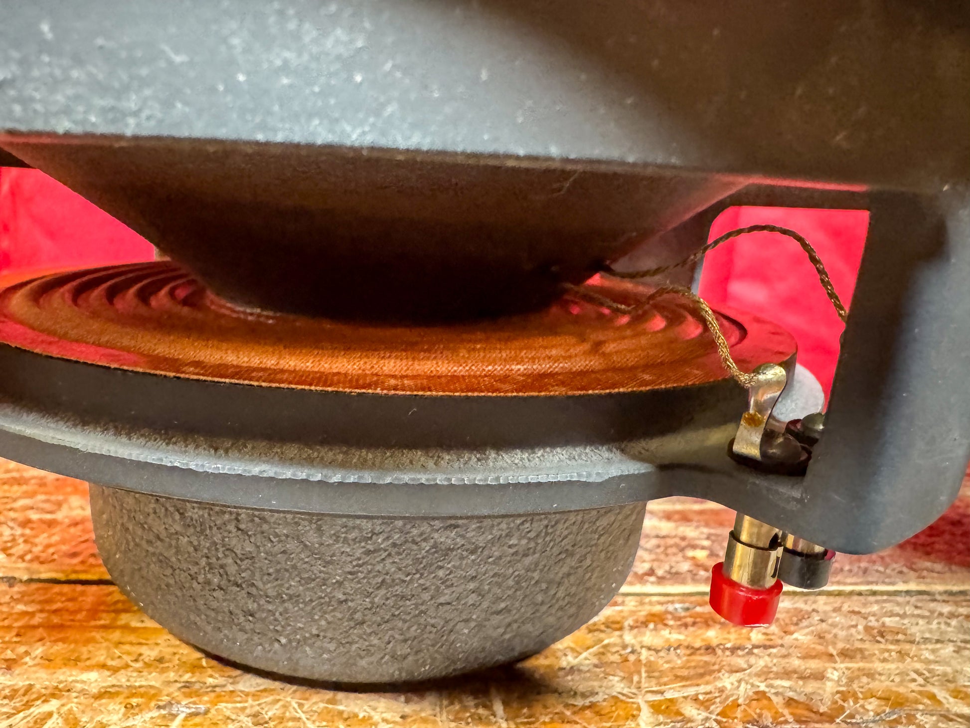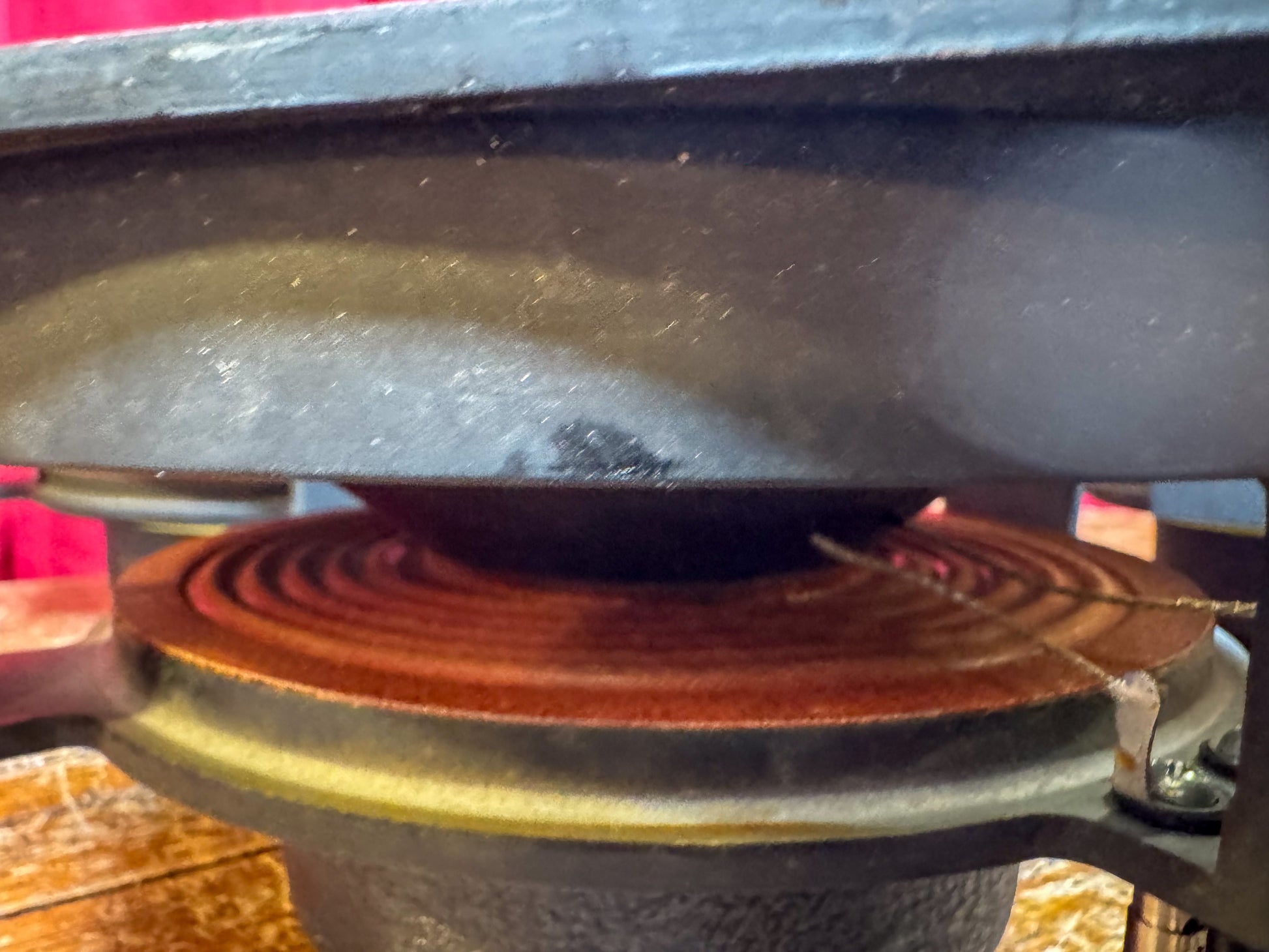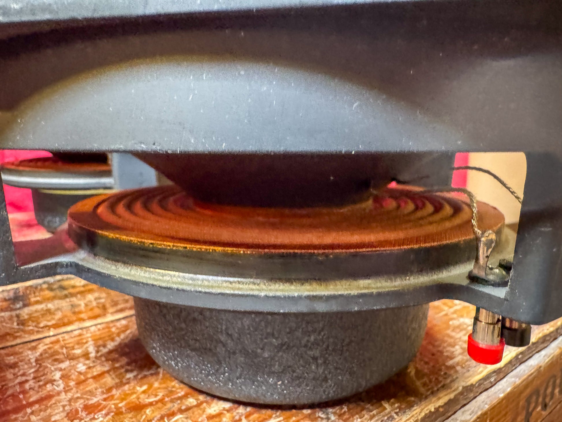 All of the cones on these speakers are original. One of cones has some slight creasing, and the dust cap had a small area that was bumped in and carefully pulled back using blue low tack tape. Please see the attached photos. One speaker does not have the white ink stamp, but the cone appears identical to the other speakers.
