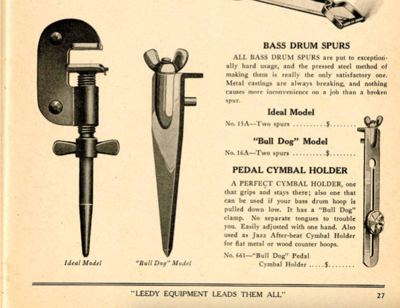 For your viewing pleasure is this pair of vintage Leedy No. 15A Ideal Model clip-on bass drum spurs. These were made in Elkhart, IN in the late 1910s and 1920s and used on the batter side of the bass drum as shown in the picture from the 1920 Leedy catalog. If you've been searching for some period correct spurs for your vintage outfit, look no further. These 100+ year old spurs are in fully functional condition with some light aging. Beautiful antique hardware that's just as usable today as it was a century ago. Enjoy!