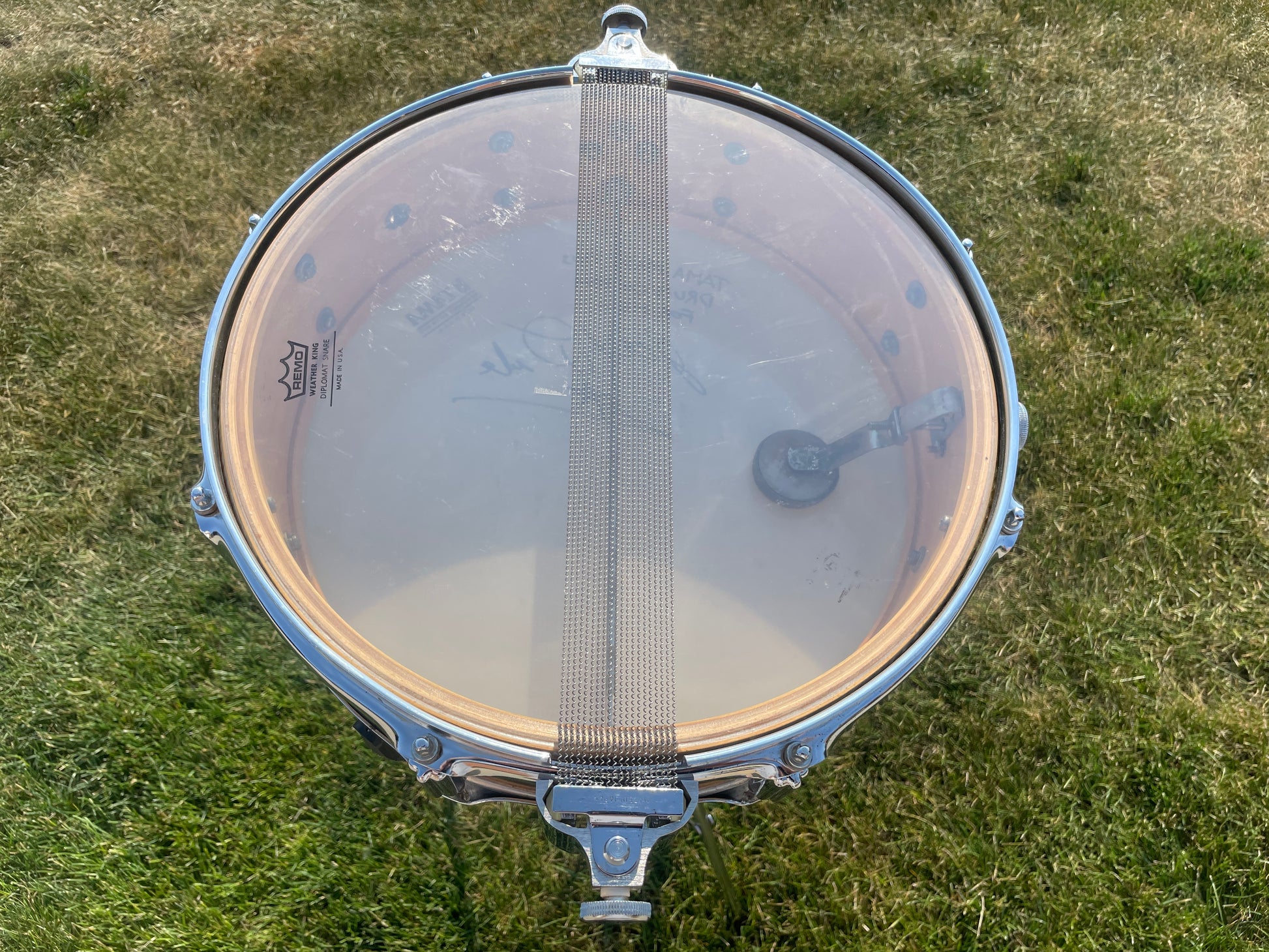 For your extreme viewing pleasure is this one of a kind, vintage Tama 4.5x15 Imperialstar snare drum made in Japan for STARZ drummer and Tama endorser Joe X. Dube in 1977. He had asked for a big, fat piccolo with the bigger frequency response of the 15" shell and the crack of a 4" depth. The factory delivered on his request, they customized the bottom hoop by cutting out the area for the wires since there wasn't a 15" snare side hoop available at the time. It's in great overall condition with minimal signs of age as it mostly lived in storage. There are some imperfections in two panels of the exterior (see pics). The KG parallel action strainer operates well with the original wires. The One Touch tone control is present, fully functional, and a great example of this innovative design. There are no extra holes or modifications. Comes with autographed head and picture. If you're a Tama fan, this is as rare and unique as it gets and would be an amazing addition to your collection that you won't want to snooze on. Enjoy!