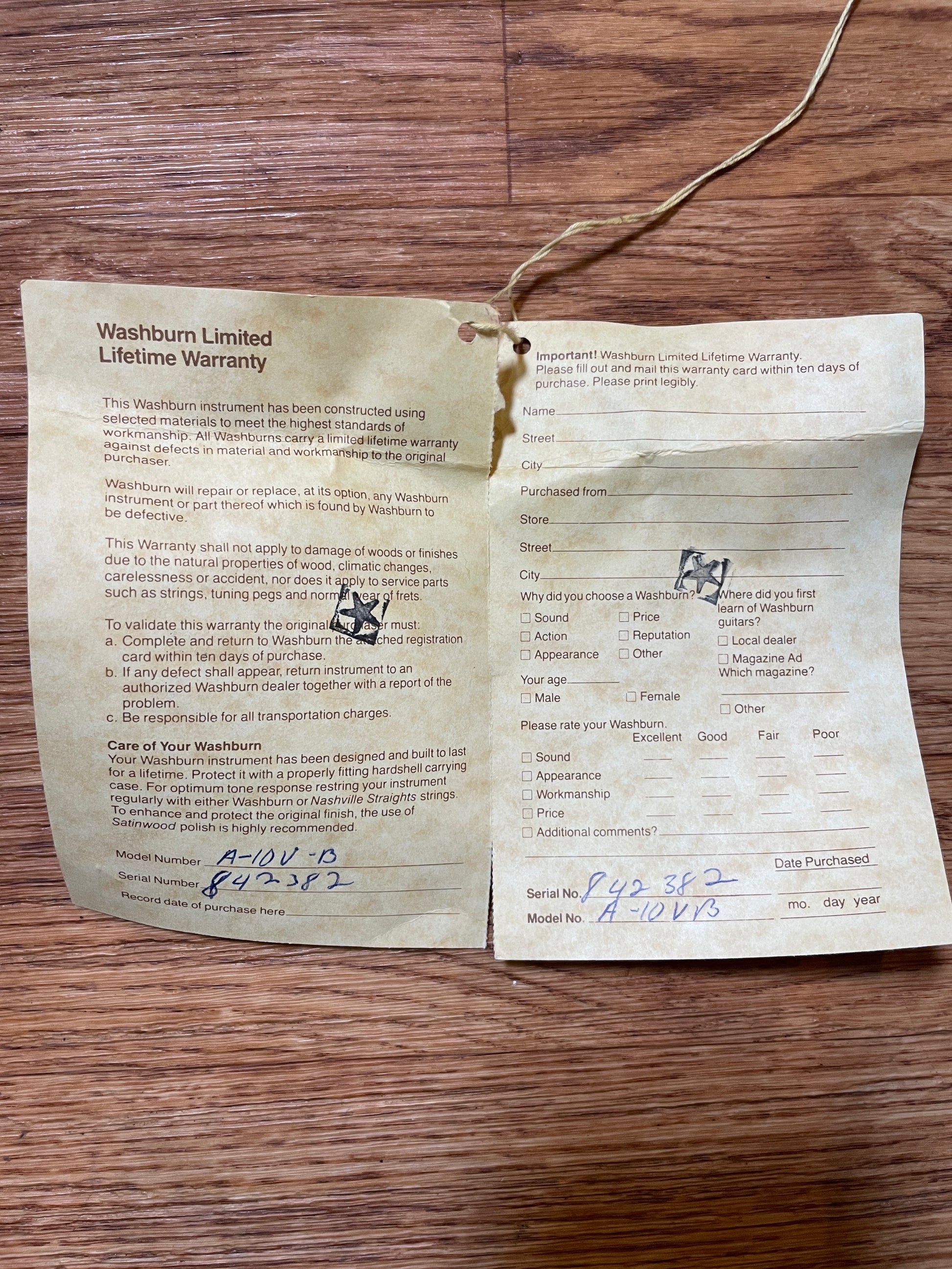 For your viewing pleasure is this gorgeous vintage Washburn A-10V from 1984. This guitar is in exceptional condition with the original hang tag and knob stickers still on the guitar. The original brown Washburn case is just as clean as the guitar. Very sharp looking black finish with red binding throughout. Plays and sounds great, you'll just need to throw a new set of strings on. One screw is missing from back spring plate. You'd be very hard pressed to find another in this condition. Enjoy!